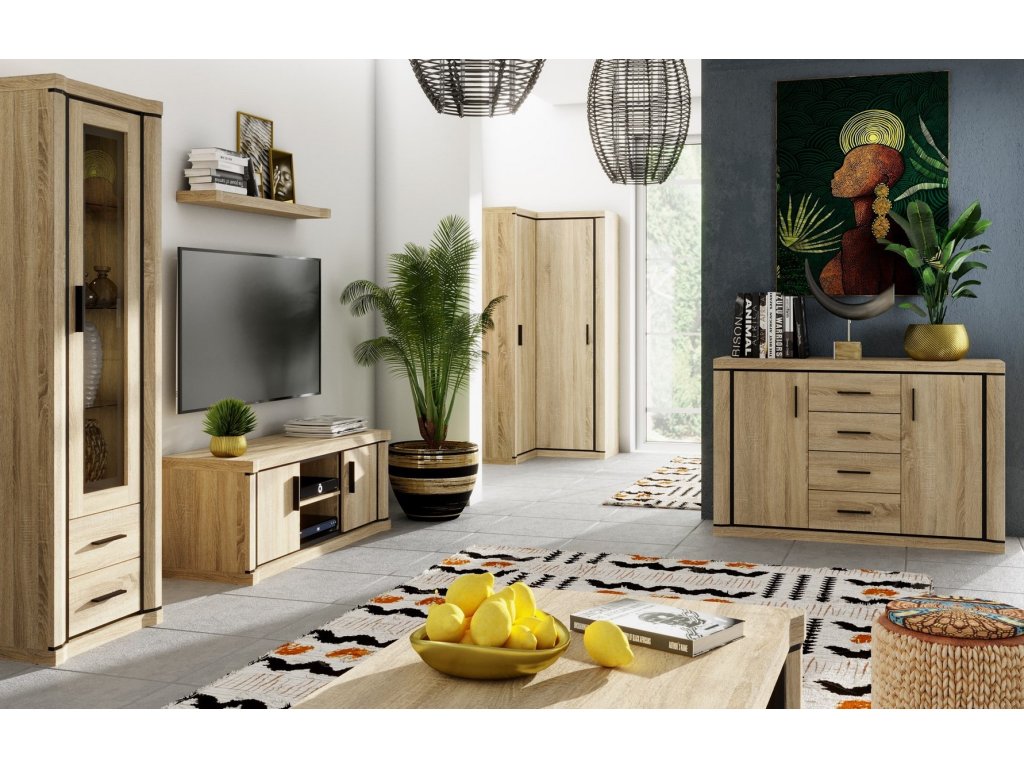 Konferenční stolek ze sektorové řady má dole poličku. Má zajímavé provedení v podobě netradičně vyřezávaných vrchních a spodních desek. Systém je exkluzivní kolekce navržena v moderním duchu. Celá řada se vyznačuje masivním vzhledem a jednoduchými tvary. Nábytek je vyroben z kvalitního LTD s lištami z MDF, součástí nábytku jsou desky 48 mm, vše opatřeno ABS páskou. Barevné provedení - dub sonoma. Má široký výběr komponentů, díky kterým lze vybavit obývací pokoj, kancelář. Dodáváme v demontovaném stavu.Doplňkové parametry