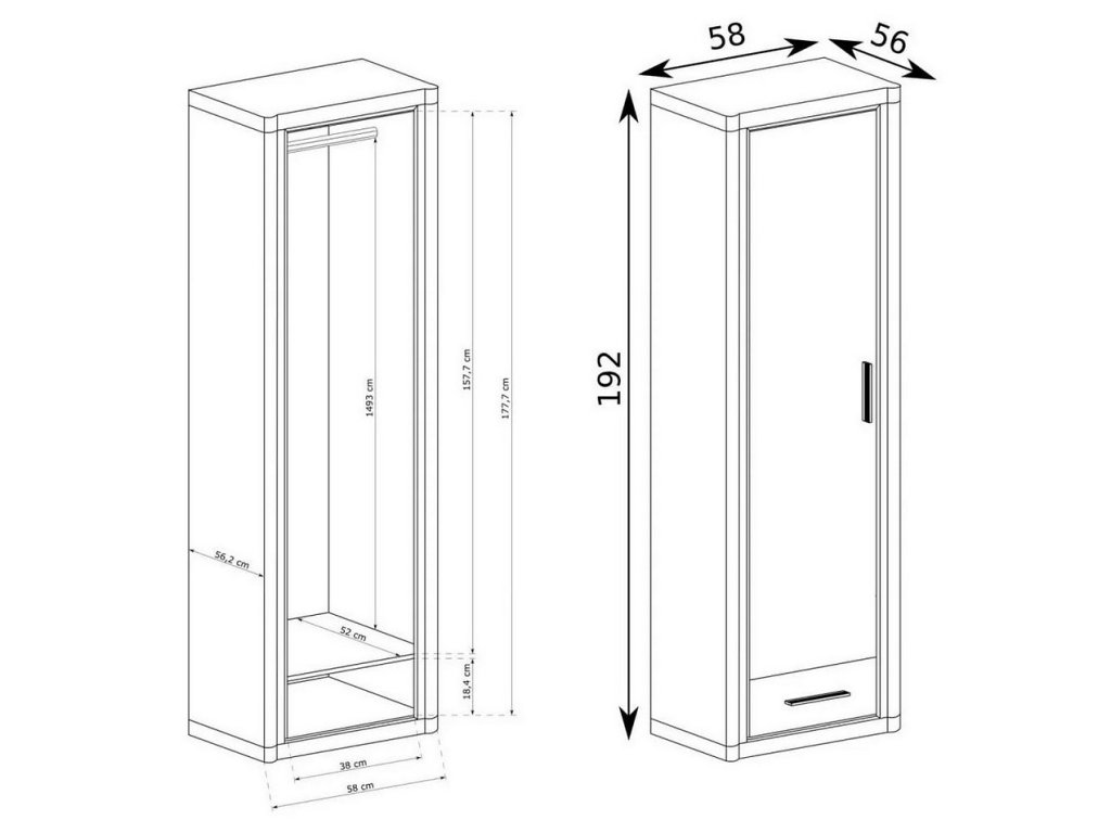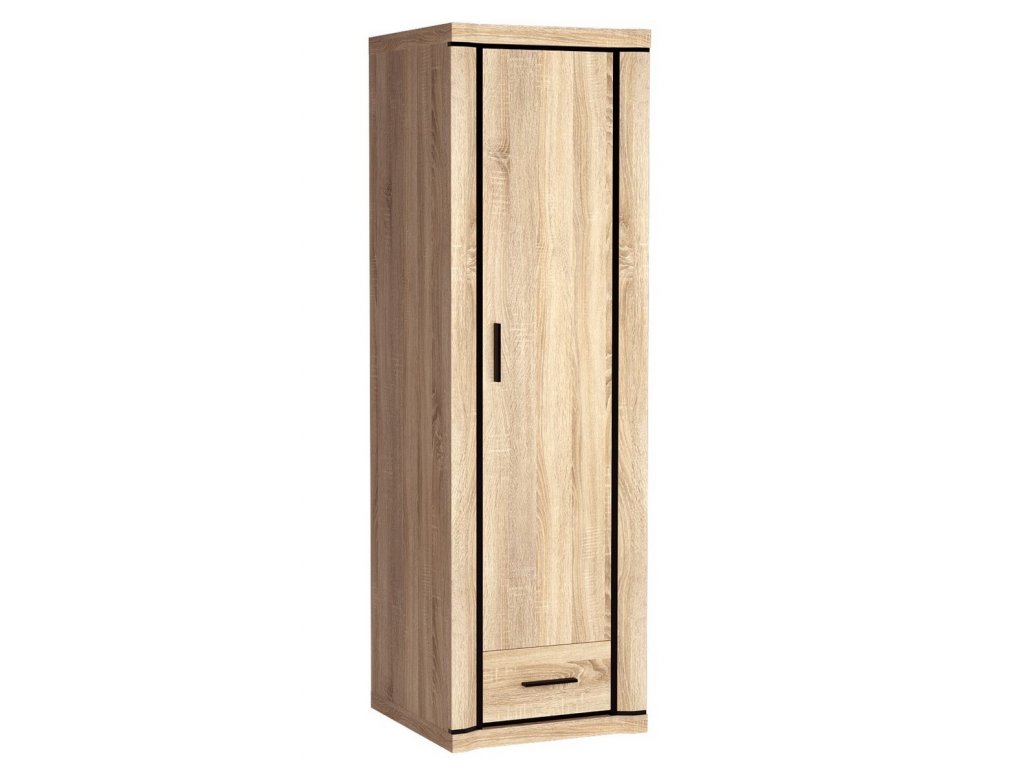 Šatní skříň 1-dveřová ze sektorové řady má šatní tyč, dole je jedna zásuvka. Má zajímavé provedení v podobě netradičně vyřezávaných vrchních a spodních desek. Systém je exkluzivní kolekce navržena v moderním duchu. Celá řada se vyznačuje masivním vzhledem a jednoduchými tvary. Nábytek je vyroben z kvalitního LTD s lištami z MDF, součástí nábytku jsou desky 48 mm, vše opatřeno ABS páskou. Barevné provedení - dub sonoma. Má široký výběr komponentů, díky kterým lze vybavit nejen obývací pokoj, ale i ložnici nebo kancelář. Možnost dokoupeni 3 polic. Skříň má univerzální otvírání dvířek. Dodáváme v demontovaném stavu.Doplňkové parametry