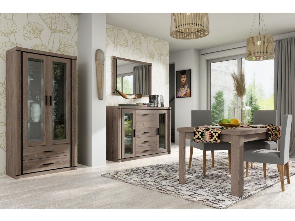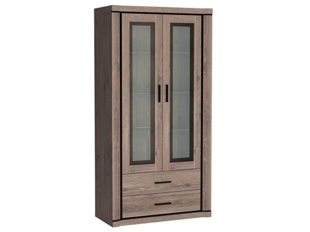 Vitrína 2-dveřová ze sektorové řady má prosklené dveře, za nimi jsou 3 skleněné poličky, dole jsou dvě zásuvky. Má zajímavé provedení v podobě netradičně vyřezávaných vrchních a spodních desek. Systém je exkluzivní kolekce navržena v moderním duchu. Celá řada se vyznačuje masivním vzhledem a jednoduchými tvary. Nábytek je vyroben z kvalitního LTD s lištami z MDF, součástí nábytku jsou desky 48 mm, vše opatřeno ABS páskou. Barevné provedení - dub lanýž. Má široký výběr komponentů, díky kterým lze vybavit nejen obývací pokoj, ale i jídelnu nebo kancelář. Možnost dokoupení osvětlení. Dodáváme v demontovaném stavu.Doplňkové parametry