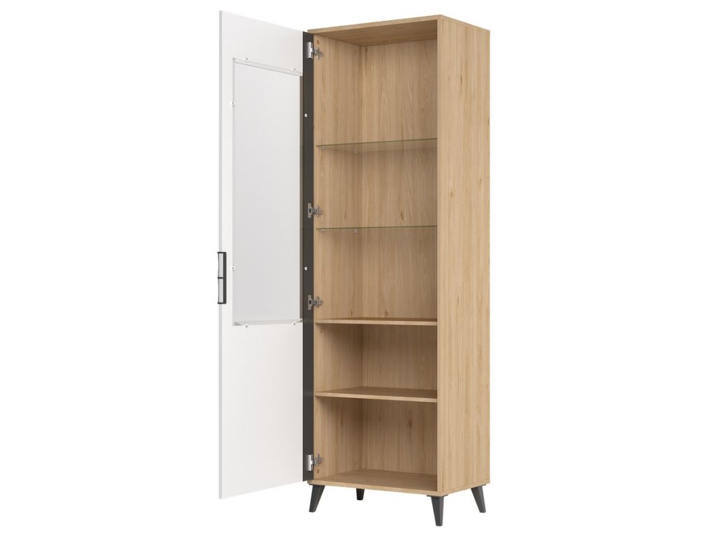 Vitrína jednodveřová v moderním provedení. Korpus je vyroben z kvalitní desky LTD v barvě ořech americký jackson, dvířka jsou vyrobeny z desky MDF v kombinaci barev bílá mat/grafit mat. Úchyty jsou kovové v barvě grafit mat, nožky jsou plastové taktéž v barvě grafit mat. Dodáváme v demontovaném stavu.Doplňkové parametry