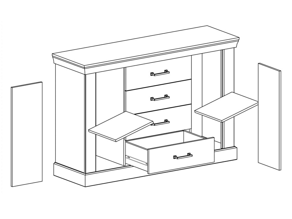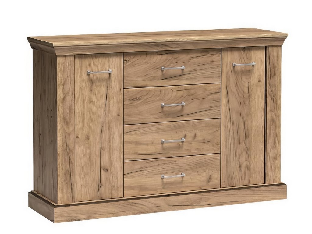 Komoda se zásuvkami. Komoda má 2 dvířka a 4 praktické zásuvky. Kolekce nábytku v sobě spojuje jednoduchost, krásný vzhled a funkčnost. Jedná se o stylovou kolekci nábytku rustikálního stylu, který je vhodný jak do ložnice tak do obývacího pokoje. Jeho barevné provedení vnese do domova lehkost a eleganci. Barevné provedení - dub zlatý kraft. Nábytek je vyroben z kvalitního lamina ohraničeného ABS páskou. Kolekce se skládá z mnoha prvků a tento široký výběr vám zaručí sestavit si nábytek podle svých vlastních představ a přání. Dodáváme v demontovaném stavu.Doplňkové parametry