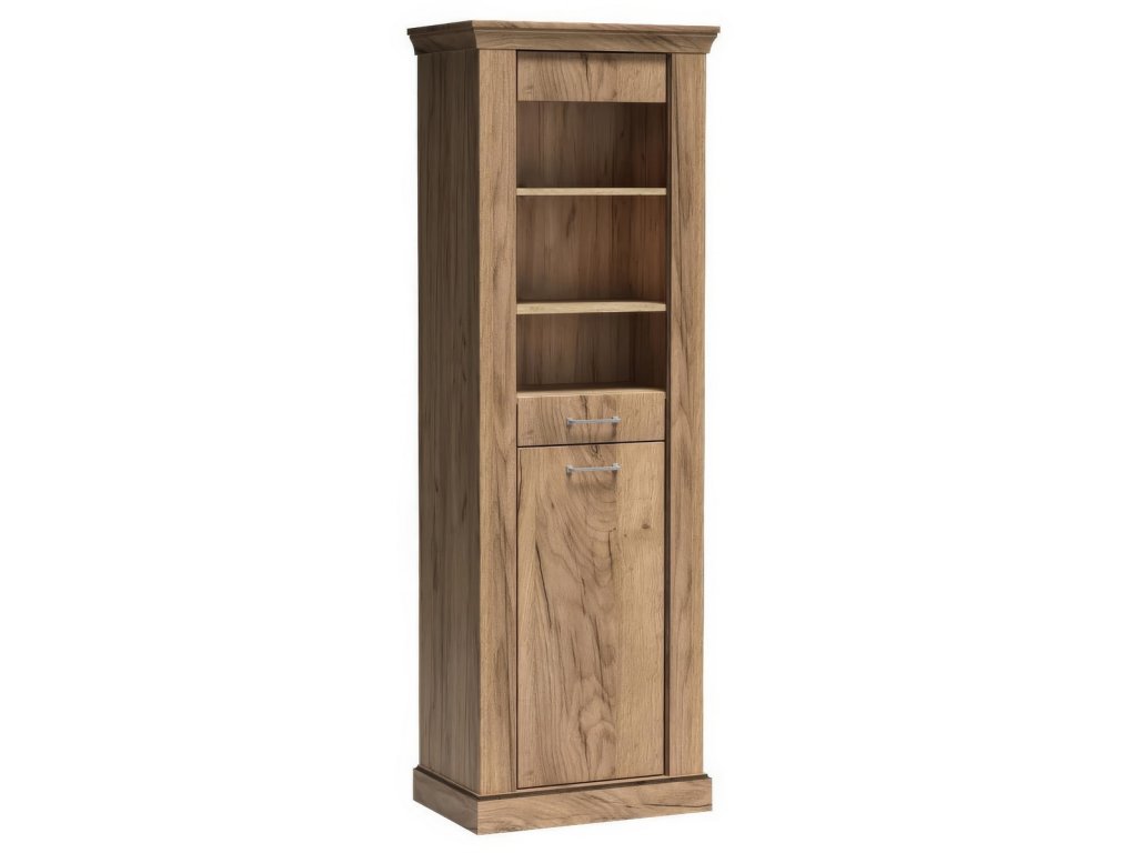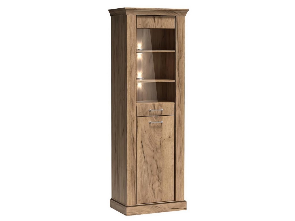 Vitrína ze sektorové řady má 2 dvířka, z toho jedny jsou prosklené. Kolekce nábytku v sobě spojuje jednoduchost, krásný vzhled a funkčnost. Jedná se o stylovou kolekci nábytku rustikálního stylu, který je vhodný jak do ložnice tak do obývacího pokoje. Jeho barevné provedení vnese do domova lehkost a eleganci. Barevné provedení - dub zlatý kraft. Nábytek je vyroben z kvalitního lamina ohraničeného ABS páskou. Možnost dokoupení LED osvětlení do vitríny. Kolekce se skládá z mnoha prvků a tento široký výběr vám zaručí sestavit si nábytek podle svých vlastních představ a přání. Dodáváme v demontovaném stavu.Doplňkové parametry