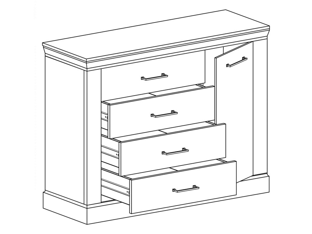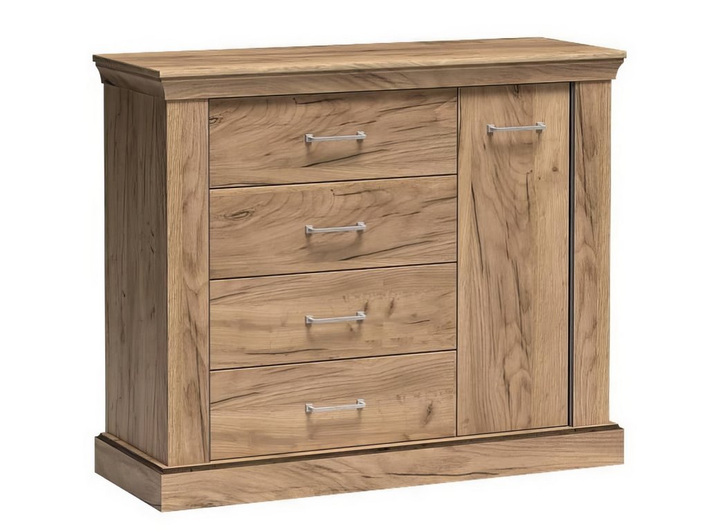 Komoda se zásuvkami. Komoda má 1 dvířka a 4 praktické zásuvky. Kolekce nábytku v sobě spojuje jednoduchost, krásný vzhled a funkčnost. Jedná se o stylovou kolekci nábytku rustikálního stylu, který je vhodný jak do ložnice tak do obývacího pokoje. Jeho barevné provedení vnese do domova lehkost a eleganci. Barevné provedení - barva dub kraft zlatý. Nábytek je vyroben z kvalitního lamina ohraničeného ABS páskou. Kolekce se skládá z mnoha prvků a tento široký výběr vám zaručí sestavit si nábytek podle svých vlastních představ a přání. Dodáváme v demontovaném stavu.Doplňkové parametry