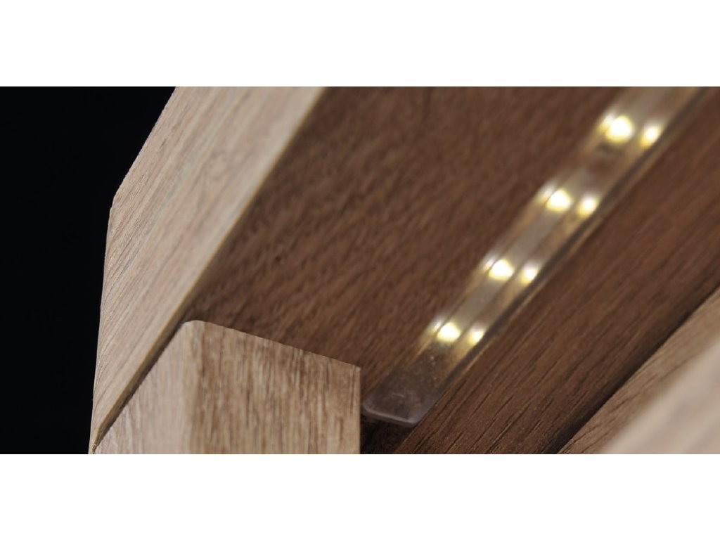 Obývací sestava s LED osvětlením v ceně v moderním bezúchytovém provedení. Kolekce nábytku v sobě spojuje jednoduchost, originální vzhled a funkčnost. Sestava se skládá z těchto položek (Š x V x H cm) - vitrína vysoká (70,5 x 197 x 40,5 cm), televizní stolek (162 x 42 x 40,5 cm) a závěsná police (120 x 40 x 21,5 cm). Nábytek je vyroben z kvalitního lamina ohraničeného ABS páskou, korpus je v barevném provedení dub ribbeck, dvířka jsou v barvě bílá lesk, doplněno lištou z MDF. Dvířka vitríny jsou univerzální takže montáž je možná na pravou nebo levou stranu a jsou vybaveny systémem tichého dovírání, doplněny tvrzeným sklem. Kolekce se skládá z mnoha prvků a tento široký výběr Vám zaručí sestavit si nábytek podle svých vlastních představ a přání. Dodáváme v demontovaném stavu.Doplňkové parametry