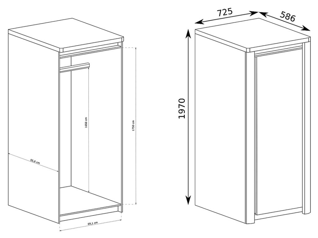 Šatní skříň jednodveřová v moderním bezúchytovém provedení. Kolekce nábytku v sobě spojuje jednoduchost, originální vzhled a funkčnost. Nábytek je vyroben z kvalitního lamina ohraničeného ABS páskou, korpus je v barevném provedení dub ribbeck, dvířka jsou v barvě bílá lesk, doplněno lištou z desky MDF. Uvnitř skříně je šatní tyč. Dvířka jsou vybaveny systémem tichého dovírání. Kolekce se skládá z mnoha prvků a tento široký výběr Vám zaručí sestavit si nábytek podle svých vlastních představ a přání. Dodáváme v demontovaném stavu.Doplňkové parametry