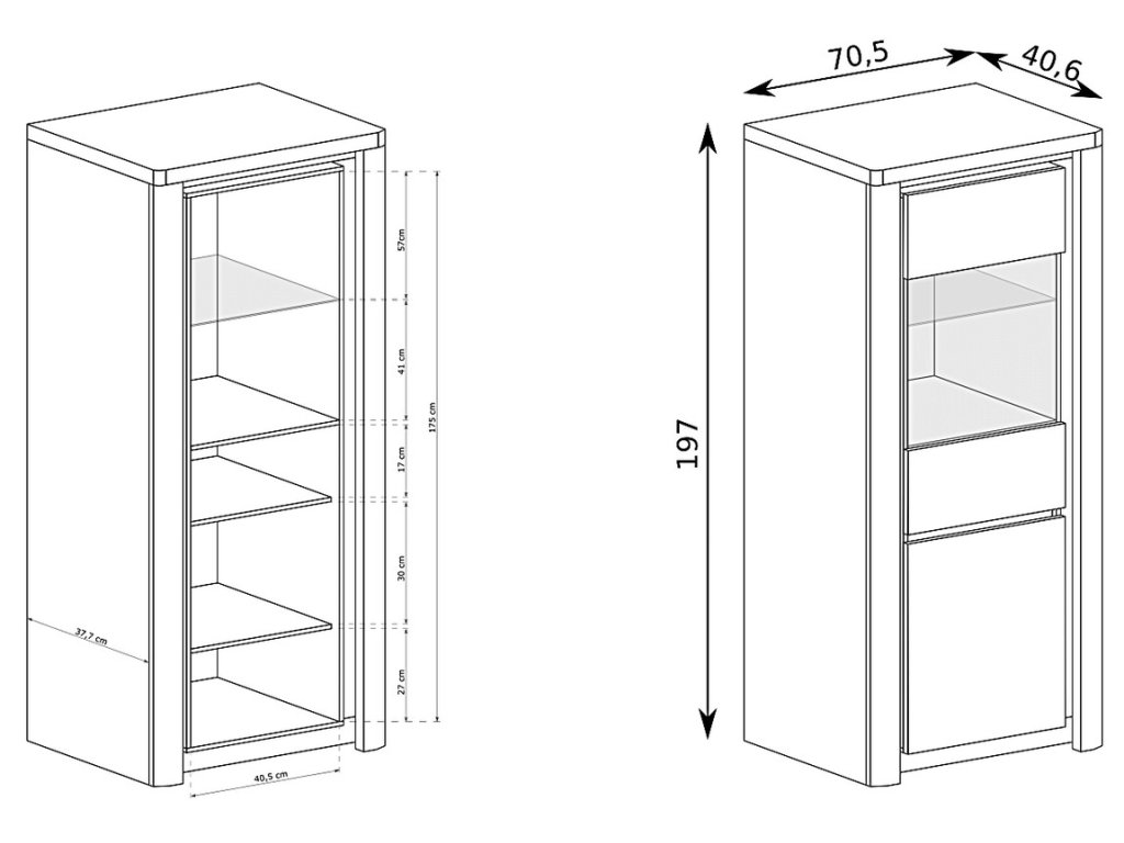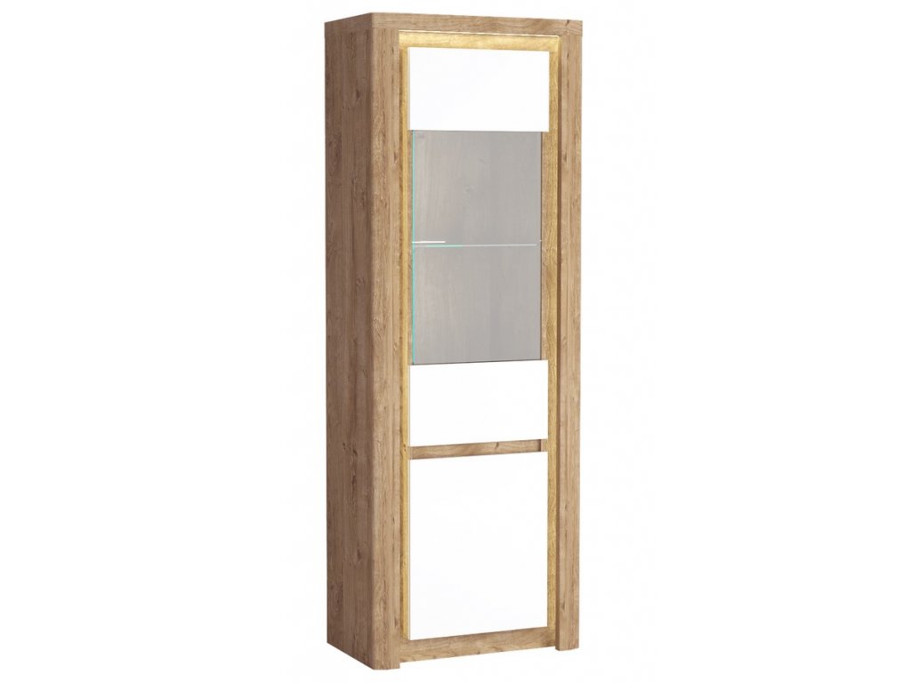 Vitrína vysoká s LED osvětlením v moderním bezúchytovém provedení. Kolekce nábytku v sobě spojuje jednoduchost, originální vzhled a funkčnost. Nábytek je vyroben z kvalitního lamina ohraničeného ABS páskou, korpus je v barevném provedení dub ribbeck, dvířka jsou v barvě bílá lesk, doplněno lištou z MDF. Dvířka jsou univerzální takže montáž je možná na pravou nebo levou stranu a jsou vybaveny systémem tichého dovírání, doplněny tvrzeným sklem. Kolekce se skládá z mnoha prvků a tento široký výběr Vám zaručí sestavit si nábytek podle svých vlastních představ a přání. Dodáváme v demontovaném stavu.Doplňkové parametry