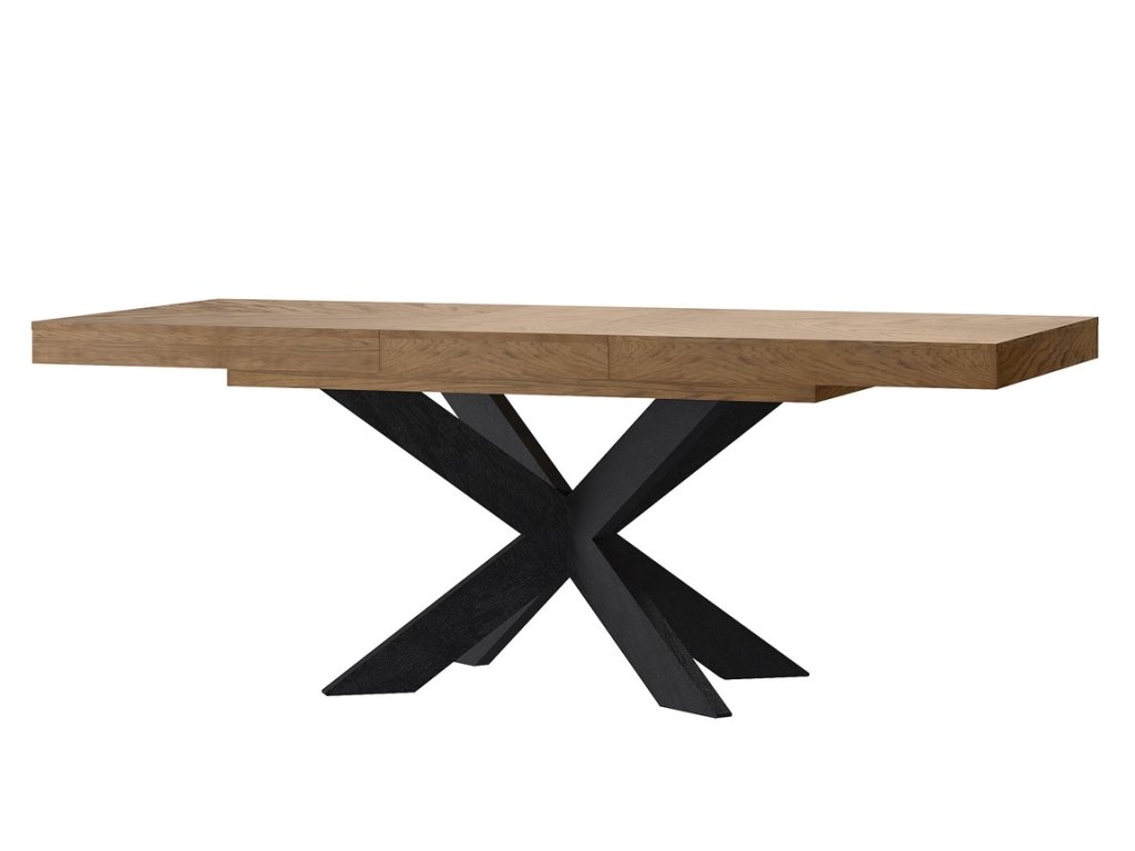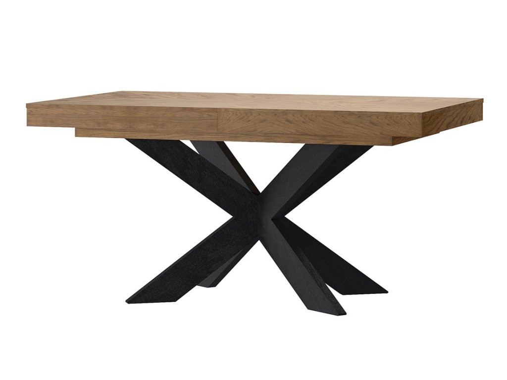 Rozkládací jídelní stůl v nadčasovém provedení. Stůl je vyroben z masivu v kombinaci s přírodní dýhou v zajímavém dekoru rybí kost v provedení dub rustikální olejovaný. Šířka stolu po rozložení je 210 cm. Nohy jsou kovové v barvě černá mat. Dodáváme v demontovaném stavu.Doplňkové parametry