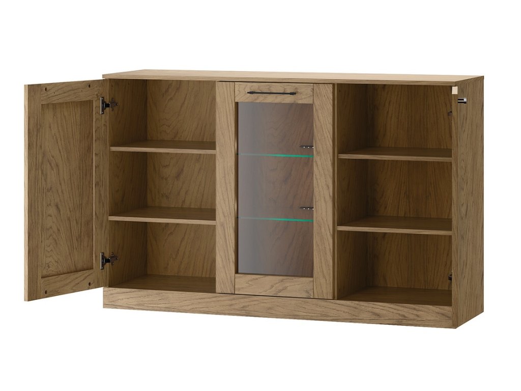 Komoda třídveřová v nadčasovém provedení. Korpus je vyroben z přírodní dýhy v barvě dub rustikální, dvířka jsou vyrobeny z masivu v kombinaci s přírodní dýhou v zajímavém dekoru rybí kost v provedení dub rustikální olejovaný. Součástí komody je také LED osvětlení prosklené části. Úchyty jsou kovové v barvě černá mat. Dvířka disponují systémem tichého dovírání. Dodáváme již ve smontovaném stavu.Doplňkové parametry