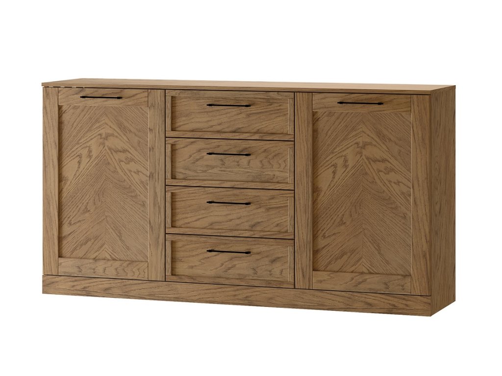 Komoda dvoudveřová se čtyřmi zásuvkami v nadčasovém provedení. Korpus je vyroben z přírodní dýhy v barvě dub rustikální, dvířka jsou vyrobeny z masivu v kombinaci s přírodní dýhou v zajímavém dekoru rybí kost v provedení dub rustikální olejovaný. Úchyty jsou kovové v barvě černá mat. Dvířka a zásuvky disponují systémem tichého dovírání. Dodáváme již ve smontovaném stavu.Doplňkové parametry
