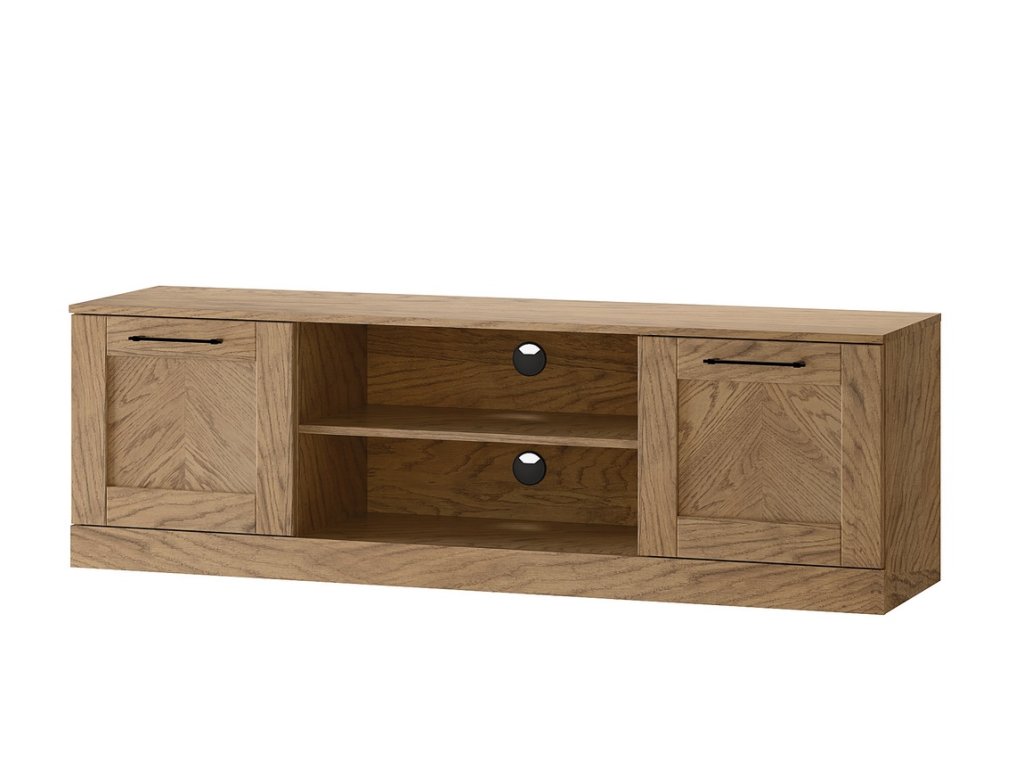 Televizní stolek se dvěma dvířky v nadčasovém provedení. Korpus je vyroben z přírodní dýhy v barvě dub rustikální, dvířka jsou vyrobeny z masivu v kombinaci s přírodní dýhou v zajímavém dekoru rybí kost v provedení dub rustikální olejovaný. Úchyty jsou kovové v barvě černá mat. Dvířka disponují systémem tichého dovírání. Dodáváme již ve smontovaném stavu.Doplňkové parametry