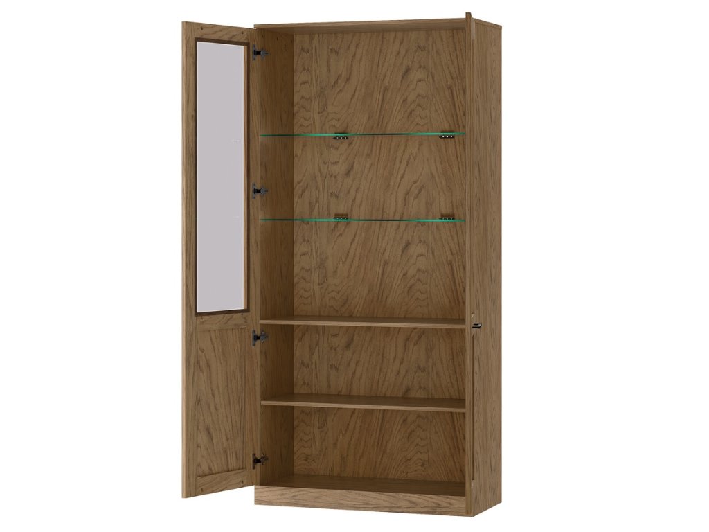 Vitrína dvoudveřová v nadčasovém provedení. Korpus je vyroben z přírodní dýhy v barvě dub rustikální, dvířka jsou vyrobeny z masivu v kombinaci s přírodní dýhou v zajímavém dekoru rybí kost v provedení dub rustikální olejovaný. Součástí vitríny je také LED osvětlení. Úchyty jsou kovové v barvě černá mat. Dvířka disponují systémem tichého dovírání. Dodáváme již ve smontovaném stavu.Doplňkové parametry