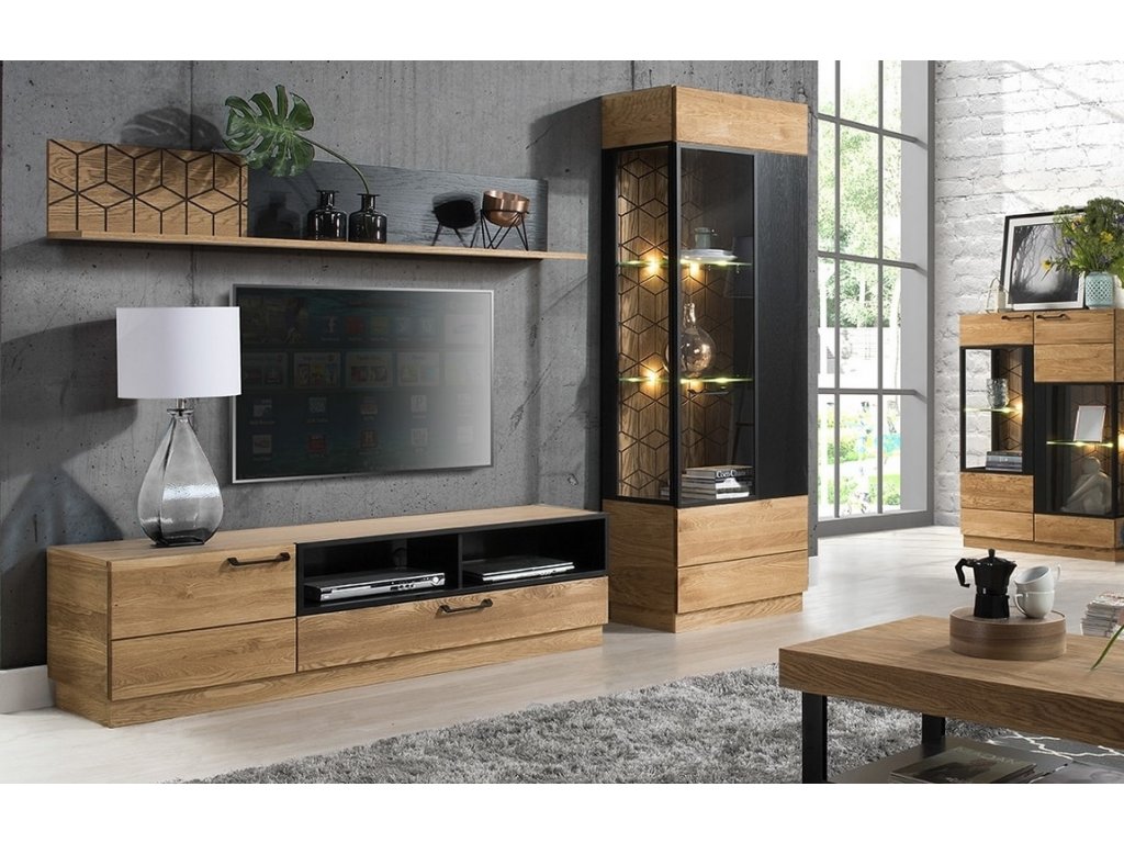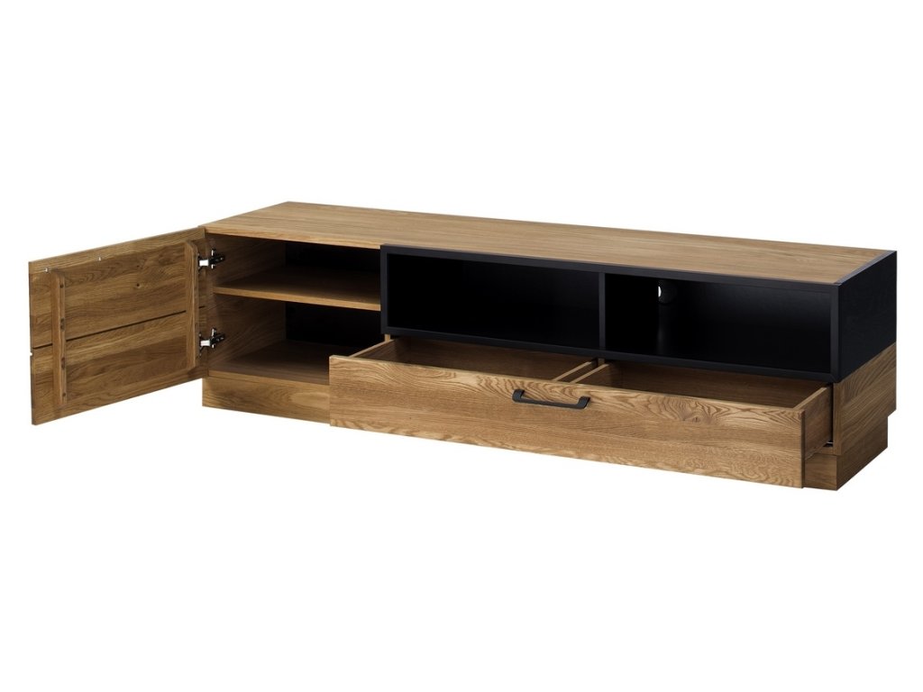 Televizní stolek s dvířky a zásuvkou ze sektorové řady MOSAIC. Moderní provedení masivního leštěného dubu s kovovými prvky dodá jedinečný vzhled vaší jídelně nebo obývacímu pokoji. Povrch vnějších částí je ošetřen olejem - dub medový nebo lakovaný - černý mat. Korpus je doplněn z vnější strany přírodní dýhou, vnitřní strana je vyrobena z desky LTD v barvě přírodního dřeva. Dvířka jsou vyrobeny z leštěného masivního dubu. Úchyty jsou kovové černé. Dodáváme již ve smontovaném stavu.Doplňkové parametry