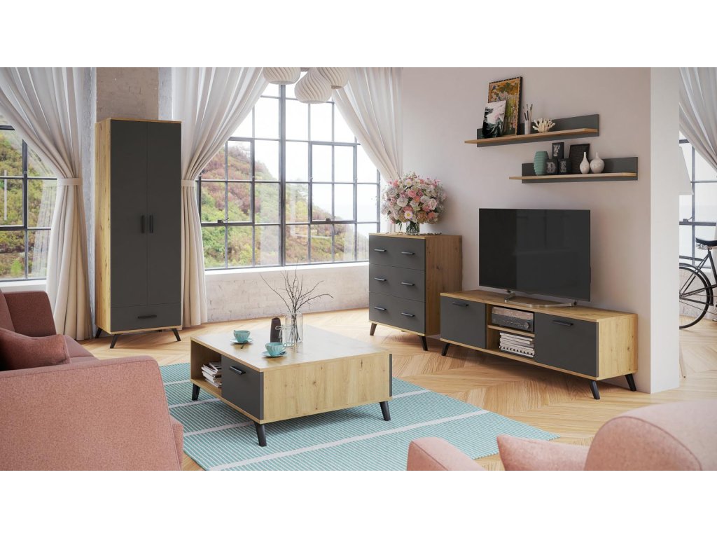 Roky Grafit je moderní bytová sestava v kombinaci 2 módních barev, grafit a dub artisan. Je vyrobena z vysoce kvalitní laminované dřevotřísky tloušťky 18 mm, odolné vůči poškrábání, vlhkosti a vysokým teplotám. Všechny hrany jsou opatřeny ABS lištou, která zajistí trvanlivost a odolnost proti nárazu. Díky této bytové stěně budete mít pohodlný i praktický interiér a také útulné a bezpečné prostředí, ve kterém se každý bude cítit dobře. Veškeré díly, které tato sestava obsahuje, si můžete objednat samostatně. Všechny prvky této sestavy jsou dodávány v demontu. Součástí je montážní plánek včetně všech potřebných spojovacích materiálů. Vyobrazené dekorace nejsou v ceně.