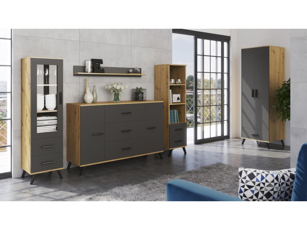 Roky Grafit je moderní bytová sestava v kombinaci 2 módních barev, grafit a dub artisan. Je vyrobena z vysoce kvalitní laminované dřevotřísky tloušťky 18 mm, odolné vůči poškrábání, vlhkosti a vysokým teplotám. Všechny hrany jsou opatřeny ABS lištou, která zajistí trvanlivost a odolnost proti nárazu. Díky této bytové stěně budete mít pohodlný i praktický interiér a také útulné a bezpečné prostředí, ve kterém se každý bude cítit dobře. Veškeré díly, které tato sestava obsahuje, si můžete objednat samostatně. Všechny prvky této sestavy jsou dodávány v demontu. Součástí je montážní plánek včetně všech potřebných spojovacích materiálů. Vyobrazené dekorace nejsou v ceně.