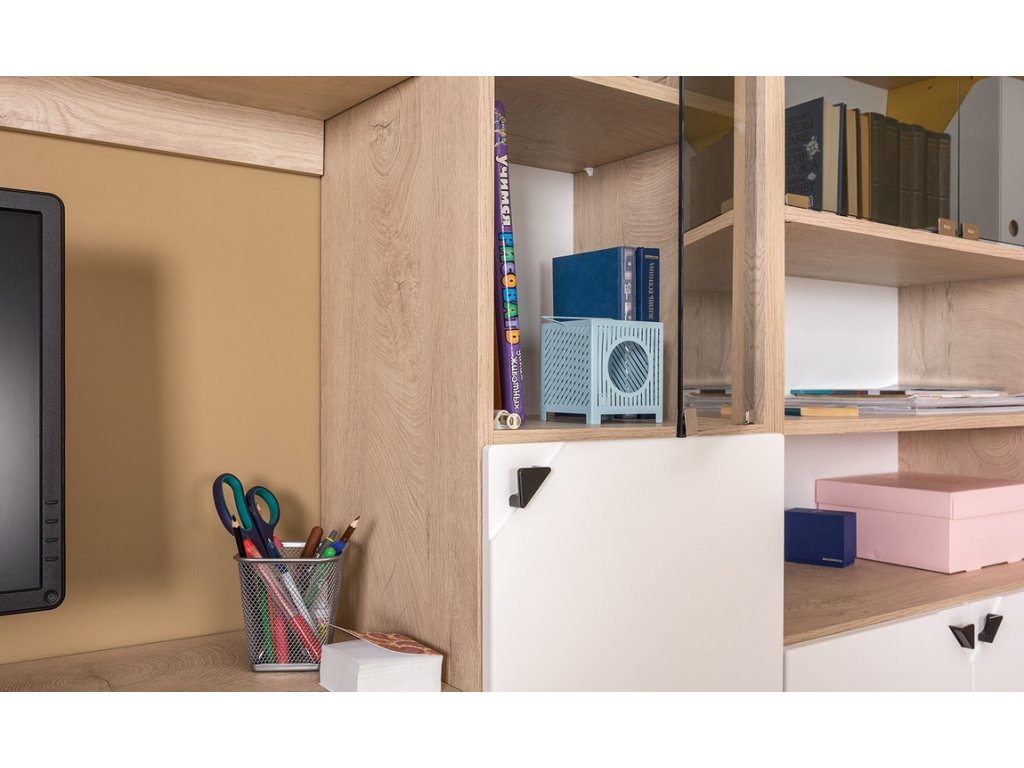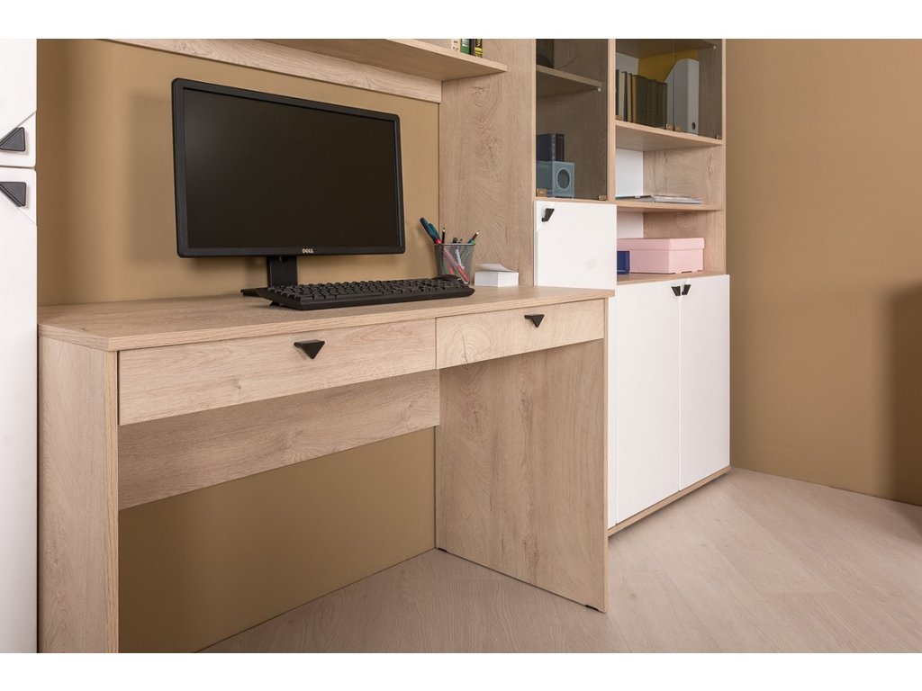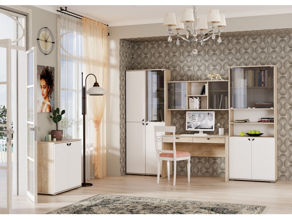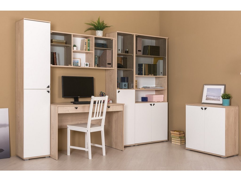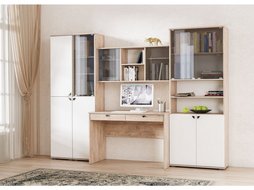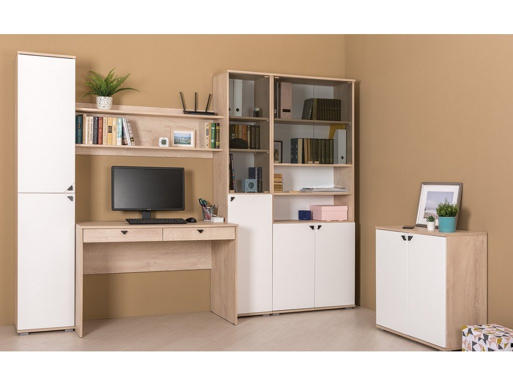 Kancelářská sestava, korpus je v barvě dub endgrain elegance, dvířka a čela zásuvek jsou z MDF v barvě milk rikamo soft. Sestava se skládá z těchto komponentů ( Š x V x H cm ) - pracovní stůl se 2 zásuvkami ( 115 x 76 x 57 ), závěsná police ( 115 x 39 x 26 ) a komoda dvoudveřová s 1 policí uvnitř ( 77 x 76 x 35 ). Úchyty jsou kovové. Dodáváme v demontovaném stavu. DOPRODEJ!Doplňkové parametry