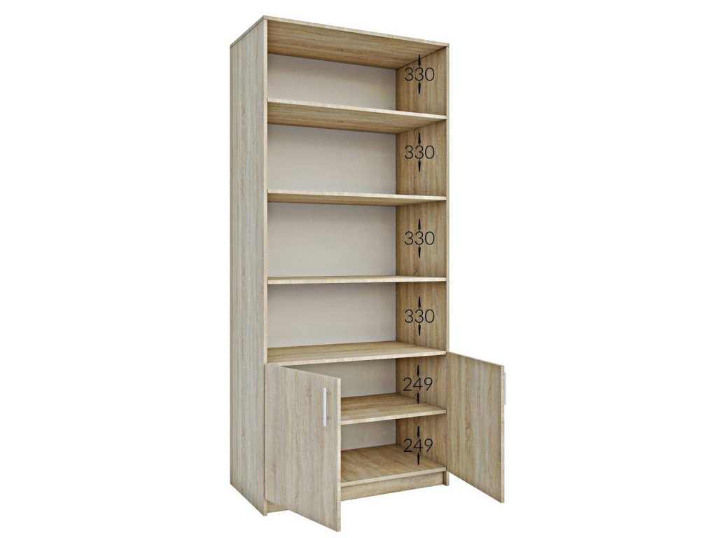 šířka: 90 cm | výška: 200 cm | hloubka: 45 cm Praktický regál s dvířky a policemi vhodný na zakládaní šanonů, knih a jiných pracovních dokumentů. Korpus i dvířka jsou z kvalitní...