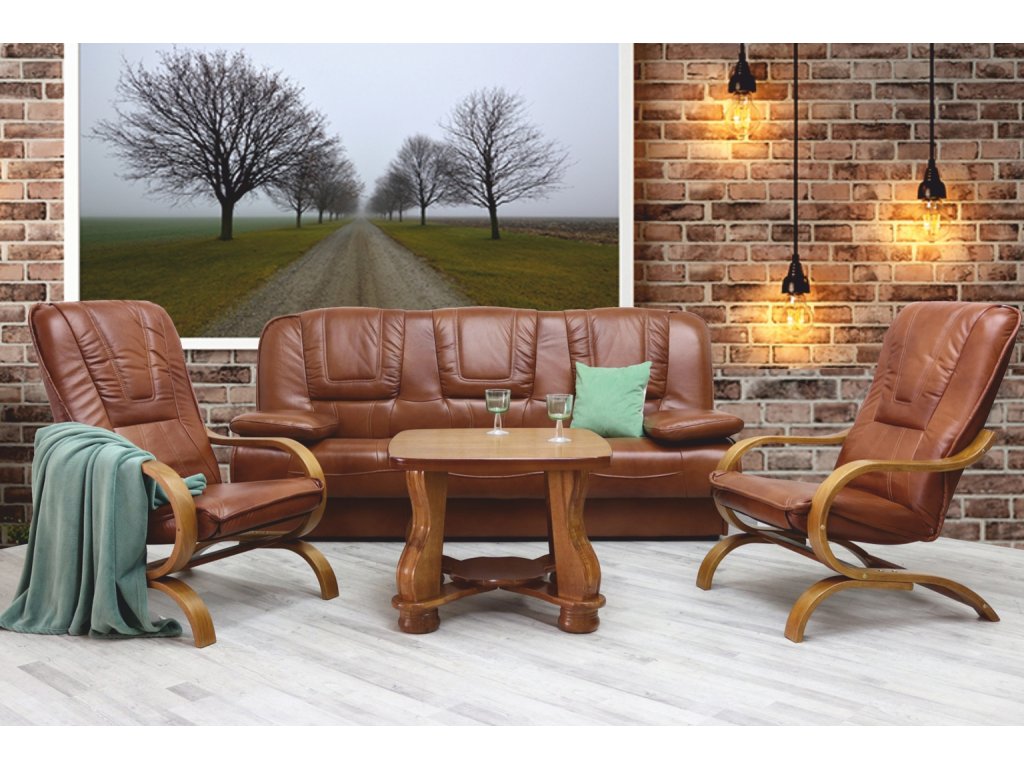 Stylová sedací souprava Frida nadchne každého, kdo má v oblibě rustikální nábytek. Její precizní a kvalitní zpracování Vám zaručí luxus a pohodlí. Jakmile se do ní jednou usadíte, nebude se Vám chtít vstát. Polstrování sedací soupravy je vyrobené z kvalitní hovězí kůže. Konstrukce je vyrobená z masivního dubového dřeva. Sedací souprava je rozkládací, plocha po rozkladu je 120 x 200 cm. V případě potřeby ji jednoduše rozložíte k občasnému přespání Vaší návštěvy. Odlehčená křesla zajišťují snadnou manipulaci. Záda pohovky nejsou potažena kůží, proto není vhodné umístění do prostoru. Kůži je nutné čistit pouze za pomocí speciálních prostředků na čištění a konzervaci přírodních kůží, dřevo je třeba čistit suchým měkkým hadříkem. Vyobrazené dopňky a dekorace nejsou v ceně. Křesla jsou dodávána v demontu.
