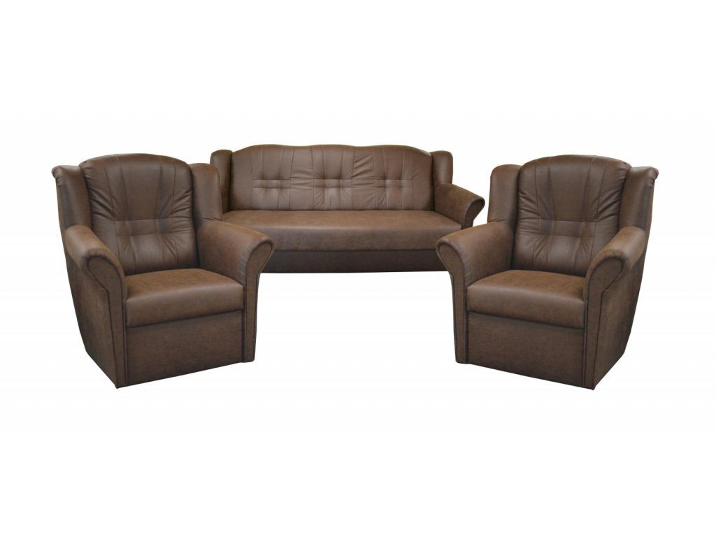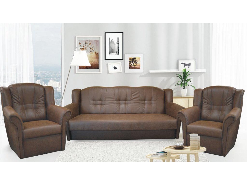 Agata je stále velmi oblíbeným klasickým modelem sedací soupravy v provedení 3F+1+1. Je velmi pohodlná a zároveň praktická. Sedací souprava je rozkládací a samozřejmostí je i úložný prostor. Jednoduchým rozkladem pomocí systému "klik klak" vznikne lůžko k příležitostnému přespání Vaší návštěvy. Sedací souprava je potažena kvalitní látkou a nabízíme ji v několika barvách, ze kterých si určitě vyberete tu nejvhodnější pro Váš obývací pokoj. Výpň sedáků tvoří pružiny v kombinaci s kvalitní PUR pěnou. Tato kombinace zajistí velmi pohodlné sezení. Cena sedací soupravy je uvedena za rozkládací trojsed a dvě křesla. Sedací souprava je potažena látkou, která imituje kůži. Látka je odolná a velmi lehce se udržuje. ÚVODNÍ FOTOGRAFIE JE ILUSTRAČNÍ. SEDACÍ SOUPRAVA BUDE DODANÁ V TMAVĚ ŠEDÉ BARVĚ.