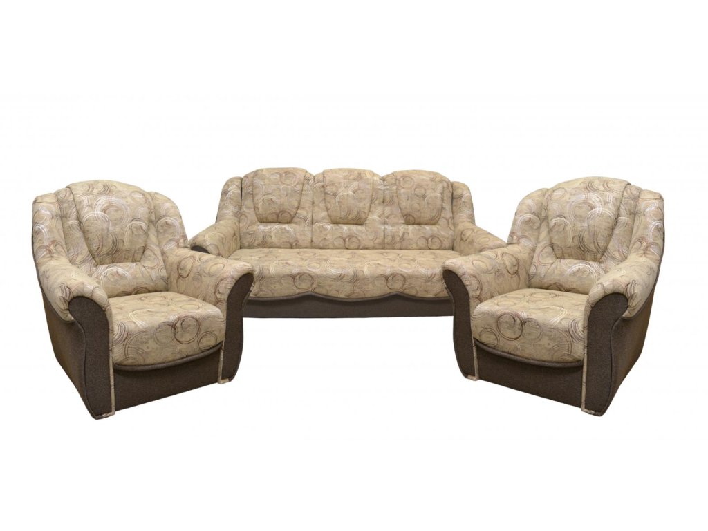 Sedací souprava Bára je stále velmi oblíbeným klasickým modelem sedací soupravy v provedení 3F+1+1. Je velmi pohodlná a zároveň praktická. Sedací souprava je rozkládací a samozřejmostí je i úložný prostor, který můžete využít např.na lůžkoviny. Jednoduchým rozkladem pomocí systému "klik klak" vznikne lůžko k příležitostnému přespání Vaší návštěvy. Sedací souprava je potažena kvalitní látkou, v kombinaci vzoru a jednobarevné látky. Cena sedací soupravy je uvedena za rozkládací trojsed a dvě křesla.