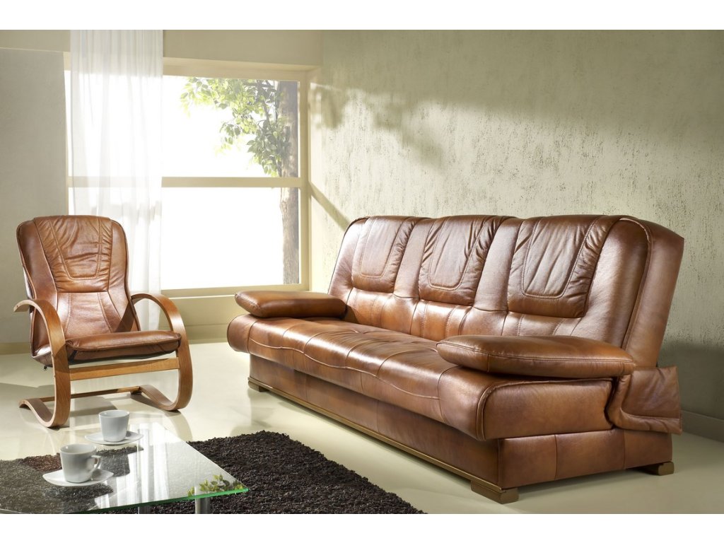 Elegantní sedací souprava, která svým vzhledem a provedením zaručuje luxus a pohodlí. Přinášíme Vám akční cenu za tuto soupravu, která obsahuje trojsedák a 1 křeslo. Trojsedák obsahuje praktický úložný prostor a je vyrobený z nejkvalitnější pravé kůže lícové. Zadní strana je potažena černou látkou, za příplatek lze zajistit sedačku celo-čalouněnou. Nohy jsou vyrobeny z masívního dubového dřeva s mořením. Hloubka sedu u pohovky je 53 cm, výška sedu 41 cm. Kožený nábytek je nutné čistit pouze za pomocí speciálních prostředků na čištění a konzervaci přírodních kůží, dřevo je třeba čistit suchým měkkým hadříkem, je možné též používat prostředky na konzervaci a ochranu dřeva neobsahující silikon. Barevné provedení - pravá kůže S42 a dřevo rustikal ( viz obrázek ). Křeslo dodáváme v demontovaném stavu.Doplňkové parametry