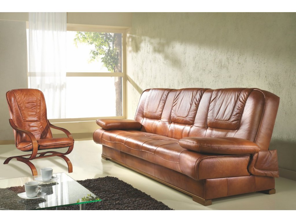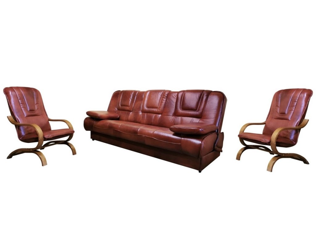 Elegantní sedací souprava, která svým vzhledem a provedením zaručuje luxus a pohodlí. Přinášíme Vám akční cenu za tuto soupravu, která obsahuje trojsedák a 2 křesla. Trojsedák obsahuje praktický úložný prostor a je vyrobený z nejkvalitnější pravé kůže lícové. Zadní strana je potažena černou látkou, za příplatek lze zajistit sedačku celo-čalouněnou. Nohy jsou plastové (viz hlavní foto). Hloubka sedu u pohovky je 53 cm, výška sedu 41 cm. Kožený nábytek je nutné čistit pouze za pomocí speciálních prostředků na čištění a konzervaci přírodních kůží, dřevo je třeba čistit suchým měkkým hadříkem, je možné též používat prostředky na konzervaci a ochranu dřeva neobsahující silikon. Barevné provedení - pravá kůže S42 a dřevo rustikal ( viz obrázek ). Křeslo dodáváme v demontovaném stavu.Doplňkové parametry