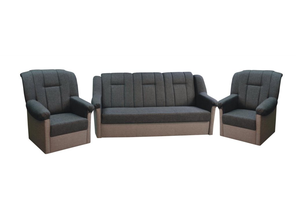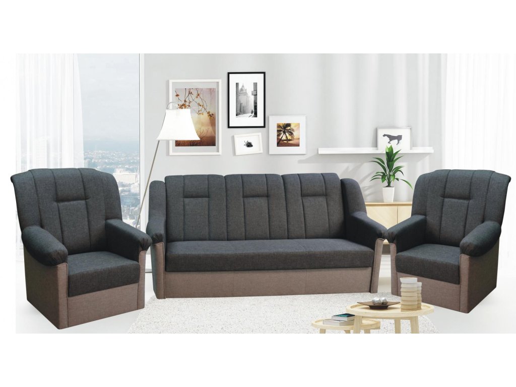 Klasická sedací souprava v šedé barvě je velice oblíbená. Je rozkládací a součástí je praktický úložný prostor. Svou kombinací trojsedu, dvou křesel a dvou taburetů...