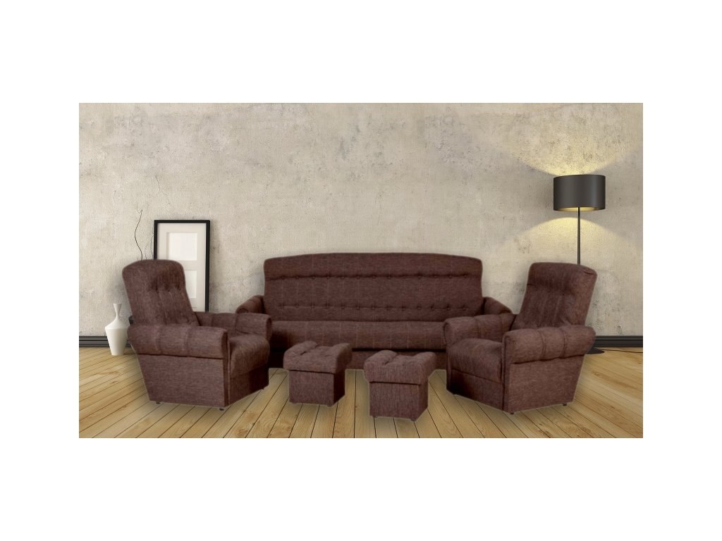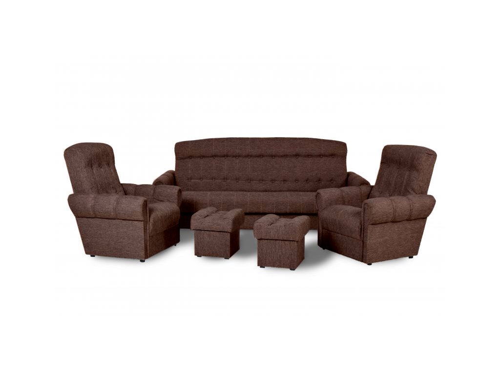 Klasická sedací souprava v hnědé barvě je velice oblíbená. Je rozkládací a součástí je praktický úložný prostor. Svou kombinací trojsedu, dvou křesel a dvou taburetů je vhodná i pro vícečlennou rodinu. Trojsed lze jednoduše rozložit stylem klik/klak a tím poslouží k občasnému přespání. Po rozložení vznikne plocha pro spaní 188 cm x 120 cm. Sedáky jsou z PUR pěny, která zajistí pohodlné sezení a vyšší opěrky ocení především starší lidé. Taburety mají také úložný prostor. Nosnost sedací soupravy do 120 kg. Dodáno v demontu.