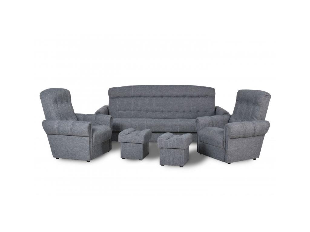 Klasická sedací souprava v šedé barvě je velice oblíbená. Je rozkládací a součástí je praktický úložný prostor. Svou kombinací trojsedu, dvou křesel a dvou taburetů je vhodná i pro vícečlennou rodinu. Trojsed lze jednoduše rozložit stylem klik/klak a tím poslouží k občasnému přespání. Po rozložení vznikne plocha pro spaní 188 cm x 120 cm. Sedáky jsou z PUR pěny, která zajistí pohodlné sezení a vyšší opěrky ocení především starší lidé. Taburety mají také úložný prostor. Nosnost sedací soupravy do 120 kg. Dodáno v demontu.