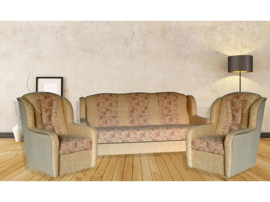 výška: celková 90 cm Elegantní sedací souprava Jana s rozkládacím trojsedem a dvěma křesly. Sedací souprava má úložný prostor a jednoduchým rozkladem vznikne lůžko na občasné...