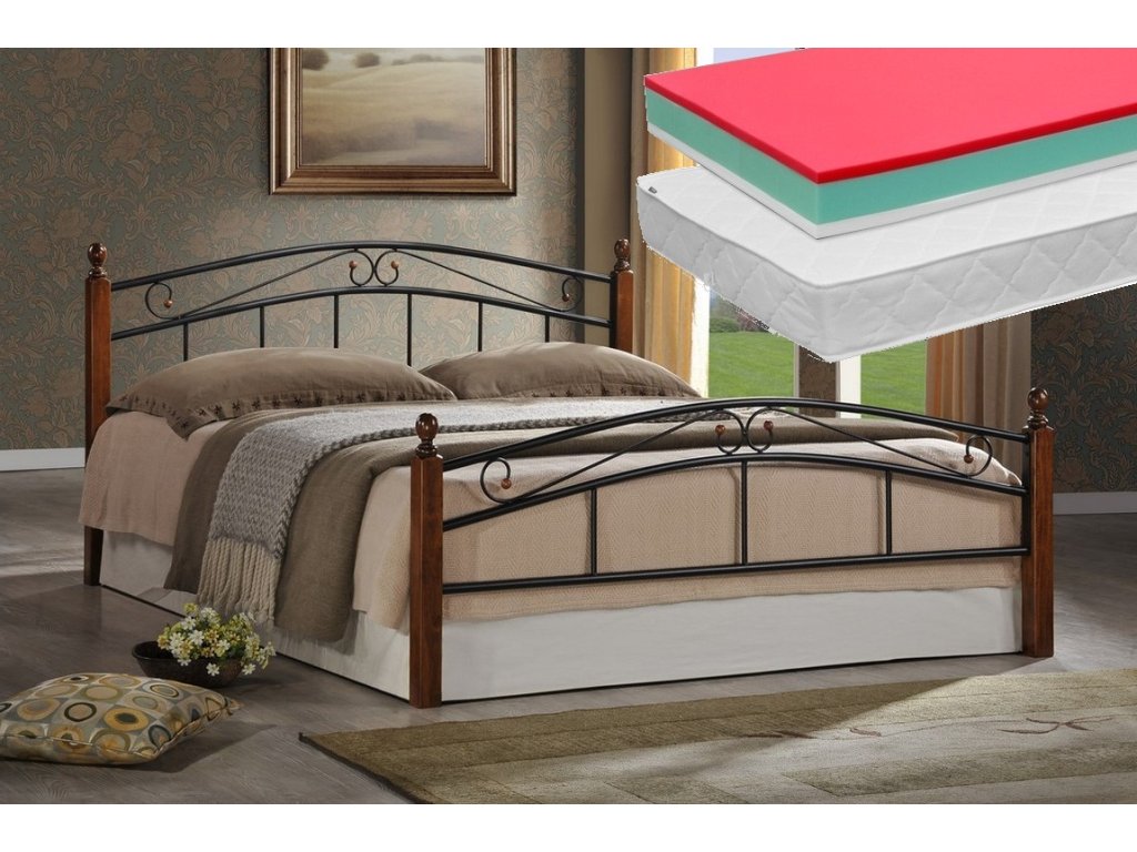 Cenově výhodná nabídka! Jedná se o 2 ks matrace LITERA 90 a k tomu postel CRETA. Popis matrace - Klasická sendvičová matrace z odolných a vzdušných pěn Flexifoam®. Ortopedická matrace s pevným potahem s lemovkou s označením tužší a měkčí strany. Strana HARD (tužší, červená, tuhost 3,5/5); Strana SOFT (měkčí, bílá, tuhost 3/5). Robustní středová část je vyrobena z prodyšné pěny – odolná, stabilní pěna Flexifoam®. Matrace má pevný nesnímatelný potah s lemovkou, který lze čistit tradičními metodami (viz všivka). Potah je prošitý klimatizační vrstvou dutého vlákna po obou stranách zajišťující pohodlí, vzdušnost a izolaci. Doporučená nosnost do 120 kg. Matrace je vhodná na všechny typy lamelových roštů, lze ji uložit i na laťkový rošt. Matrace jsou 2 kusy o rozměru 90 x 200 cm. Popis postele - elegantní postel v klasickém stylu. Zajímavá kombinace kovu a dřeva. Kvalitní masivní dřevo je v barevném provedení antická třešeň. Rám je kovový, tak jako i originální mříže v černé barvě na předním i zadním čele. Dřevěné lamely jsou vsazeny do kovového rámu postele. Rošt je v ceně. Rošt je cca 27,6 cm nad zemí. Výška při nohách - 63,5 cm. Dodáváme v demontovaném stavu.Doplňkové parametry