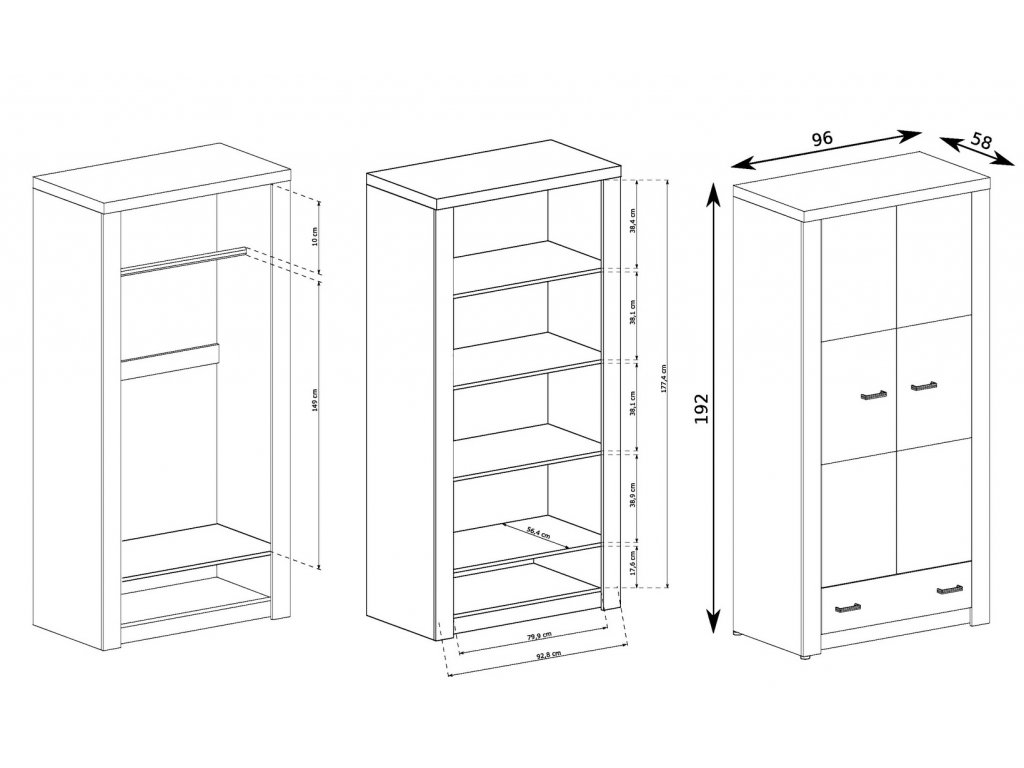 šířka: 96 cm | výška: 192 cm | hloubka: 58 cm Šatní skříň ze sektorové řady. Skříň má 2 dveře a 1 zásuvku. Uvnitř skříně je prostor se šatní tyčí. Systém je exkluzivní kolekce...
