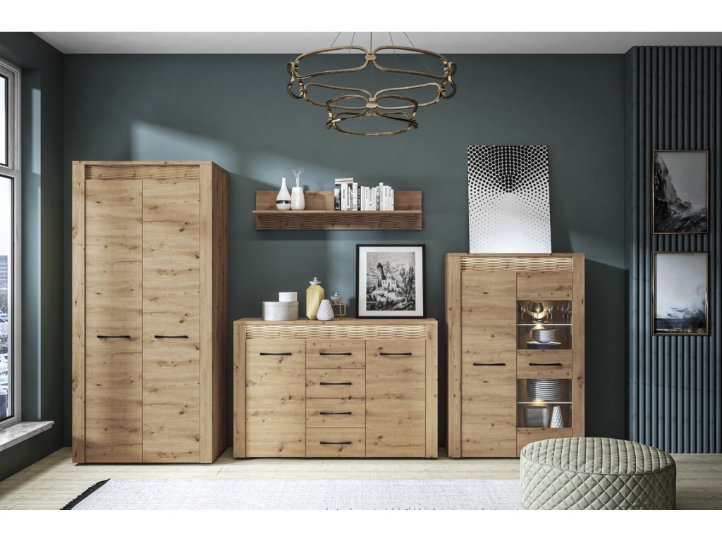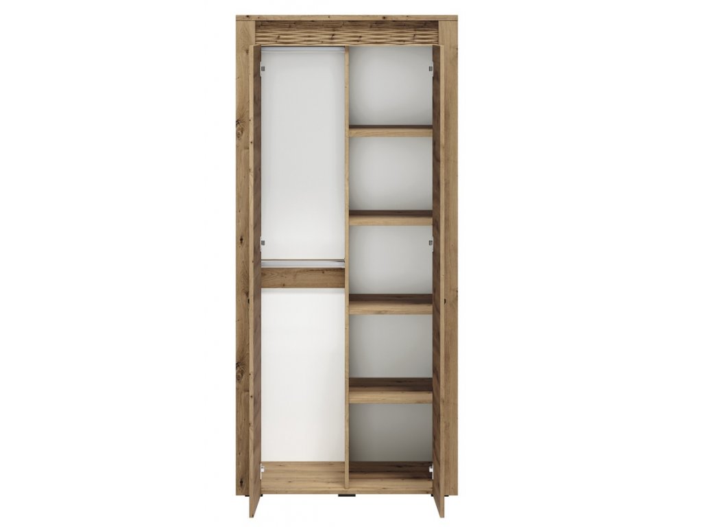 Šatní skříň dvoudveřová je vyrobena z kvalitní desky LTD hraněné ABS páskou v barvě dub artisan. Dvířka jsou vybaveny systémem tichého dovírání. Dekorační riflovaná lišta nahoře je z MDF. Úchyty jsou kovové černé. Dodáváme v demontovaném stavu.Doplňkové parametry
