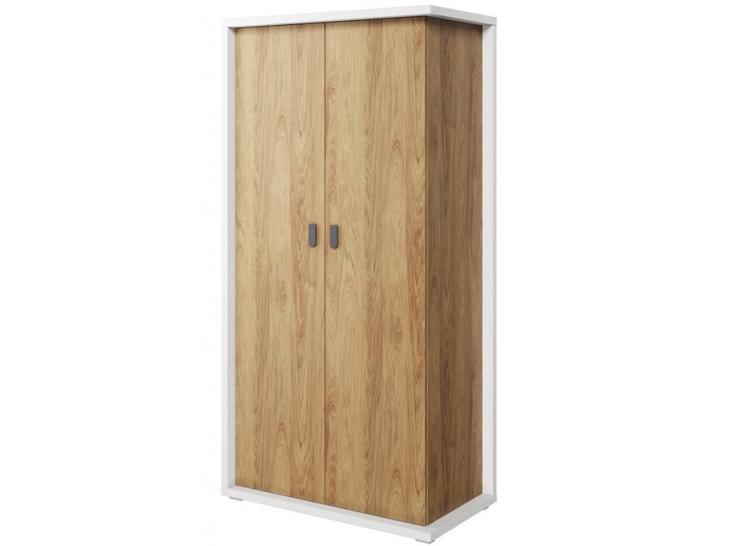 Šatní skříň dvoudveřová v jemném přírodním stylu. Korpus je vyroben z desky LTD v barvě bílá, dvířka a police jsou vyrobeny z desky LTD v barvě ořech natural. Uvnitř skříně je šatní tyč a police. Dodáváme v demontovaném stavu.Doplňkové parametry