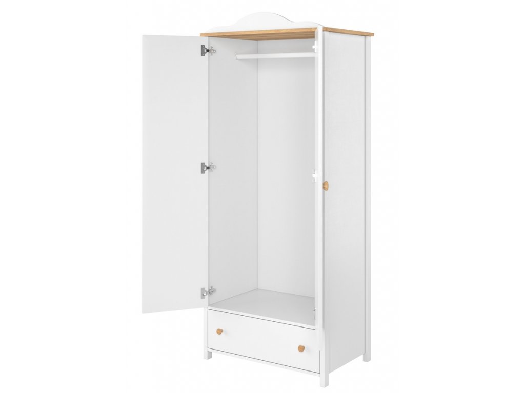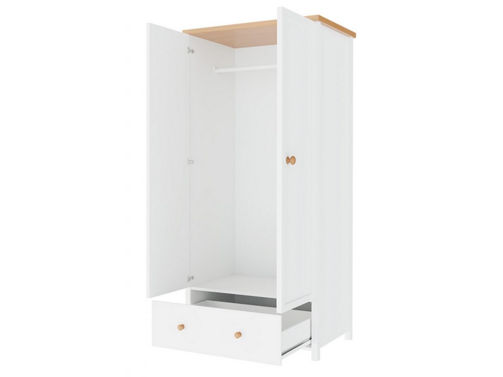 Dvoudveřová šatní skříň. Tento elegantní nábytek dodá romantickou atmosféru pokojíčku malé princezny i větší slečny. Skříň je vyrobena z desky LTD v kombinaci s MDF v barvě bílé s doplňkovou barvou dub Nash ( 22 mm ). Uvnitř skříně je šatní tyč. Ve spodní části je prostorná zásuvka. Úchyty jsou plastové v barvě dub Nash. Dodáváme v demontovaném stavu.Doplňkové parametry