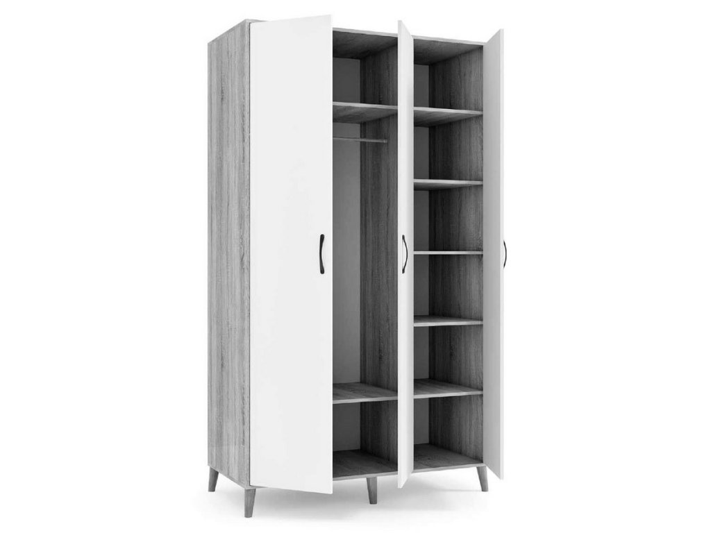 Šatní skříň třídveřová, korpus je vyroben z LTD desky odolné vůči poškrábání v barvě antracit, dveře jsou vyrobeny z desky MDF v barvě dub wotan. V levé části skříně je šatní tyč a dvě police, pravá část skříně je vybavena pěti policemi. Úchyty a nožky jsou v barvě antracit. Dodáváme v demontovaném stavu.Doplňkové parametry