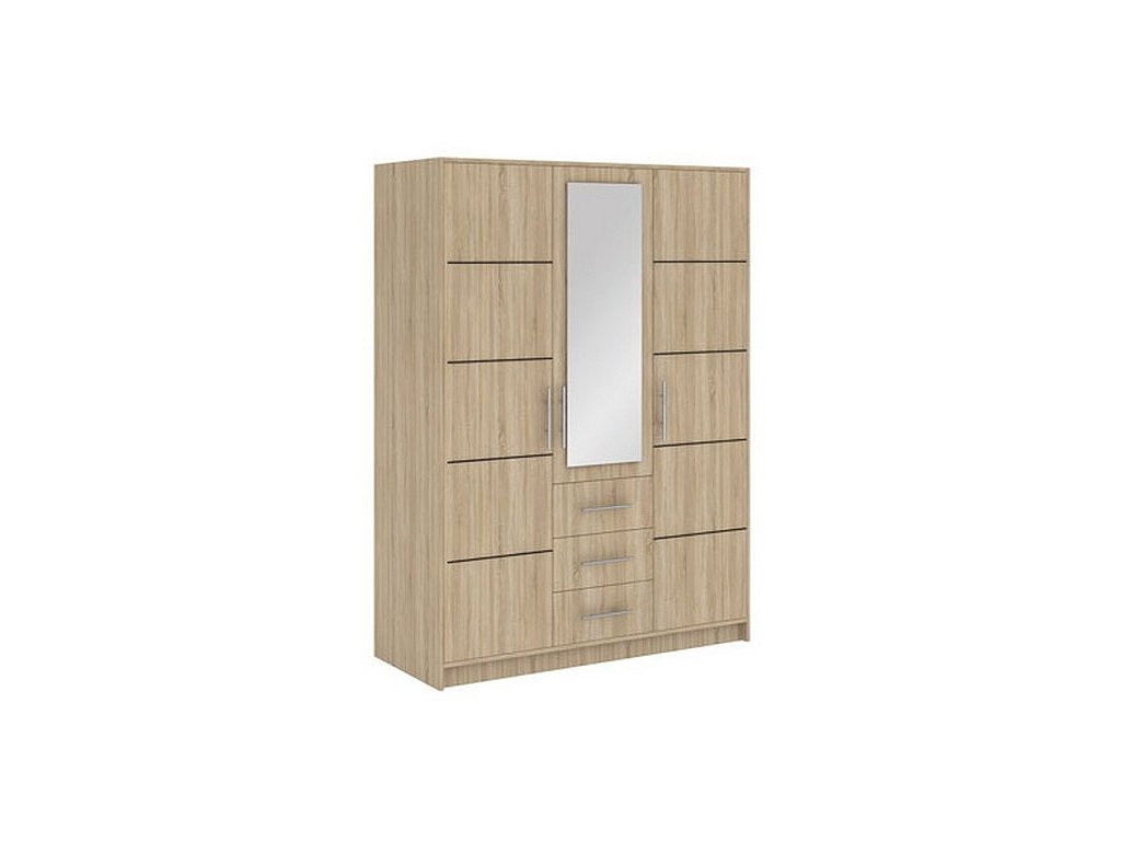 Šatní skříň 3-dveřová v moderním provedení. Korpus i dvířka jsou z kvalitního LTD v barvě dub sonoma. Skříň obsahuje praktické zrcadlo. Dveře skříně jsou dekorovány tenkými černými lamelami. Uspořádání polic viz. perokresba. Dodáváme v demontovaném stavu.Doplňkové parametry