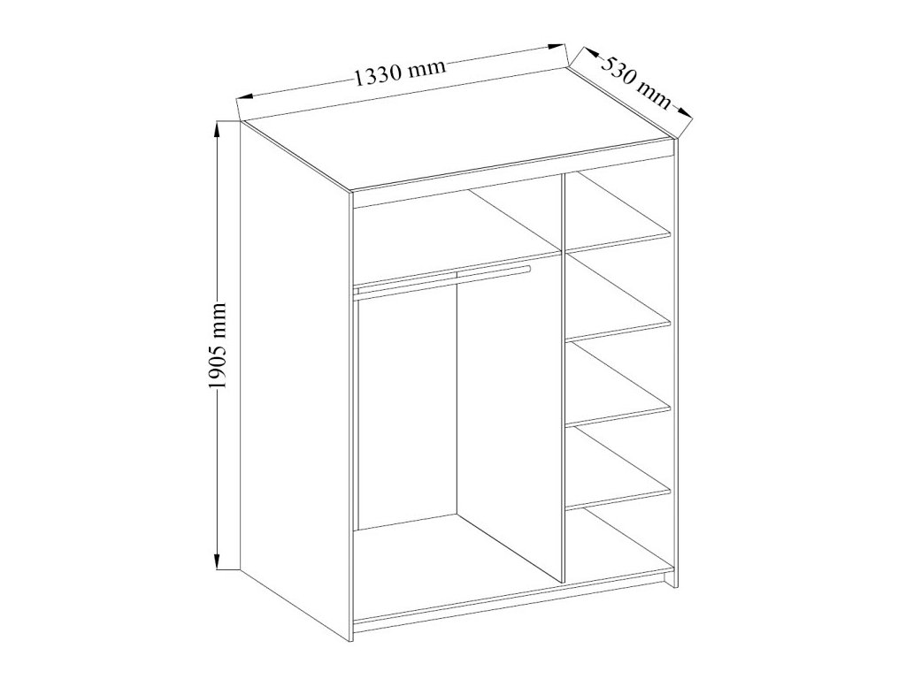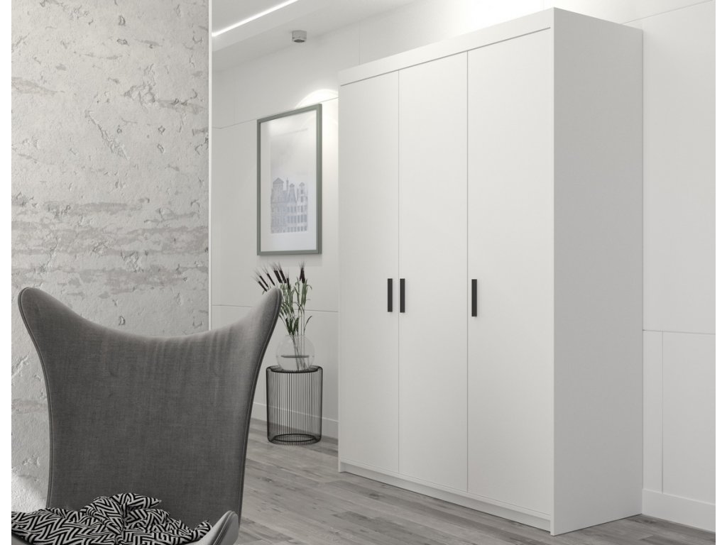 Šatní skříň ve stylovém, ale velmi praktickém provedení. Nábytek je vyrobený z lamina v barvě bílá mat. Lamino je odolné proti poškrábání, poškození, vlhkosti a vysokým teplotám. Vnitřní prostor vyobrazen na perokresbě. Možnost dokoupení nádstavce nad skříň. Dodáváme v demontovaném stavu.Doplňkové parametry