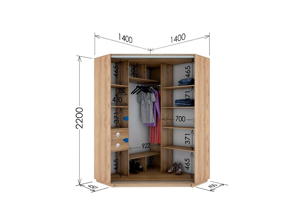 Šatní skříň rohová s posuvnými dveřmi v moderním provedení. Nezvyklá výška 220 cm Vám nabídne větší úložný prostor. Korpus je z kvalitní LTD desky v barvě dub sonoma. Skříň má kování a lišty zlaté barvy, dveře jsou osazeny zrcadly. Uspořádání polic viz. obrázek. Vnitřní 2 zásuvky nejsou v ceně, možnost dokoupení (modrá barva naznačuje, kam lze zásuvky umístit). Dodáváme v demontovaném stavu. Doporučujeme dokoupení i praktického bočního regálu, který naleznete v naší nabídce.Doplňkové parametry