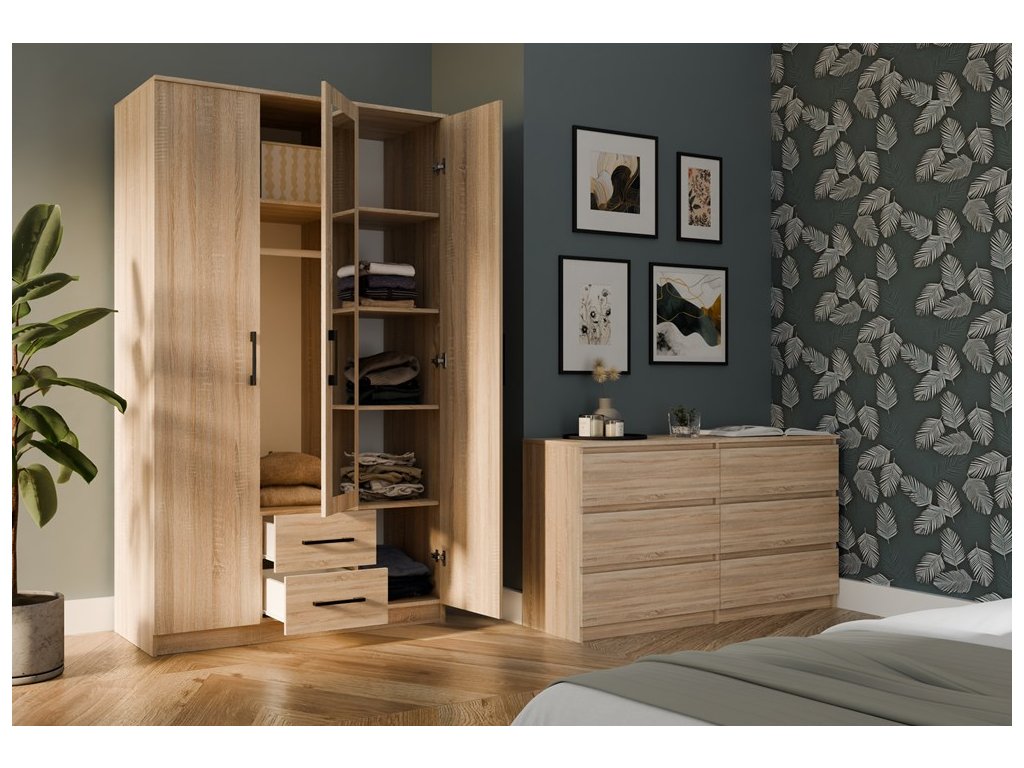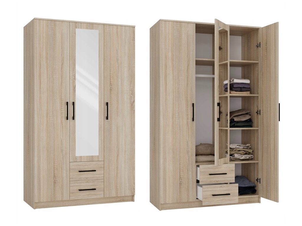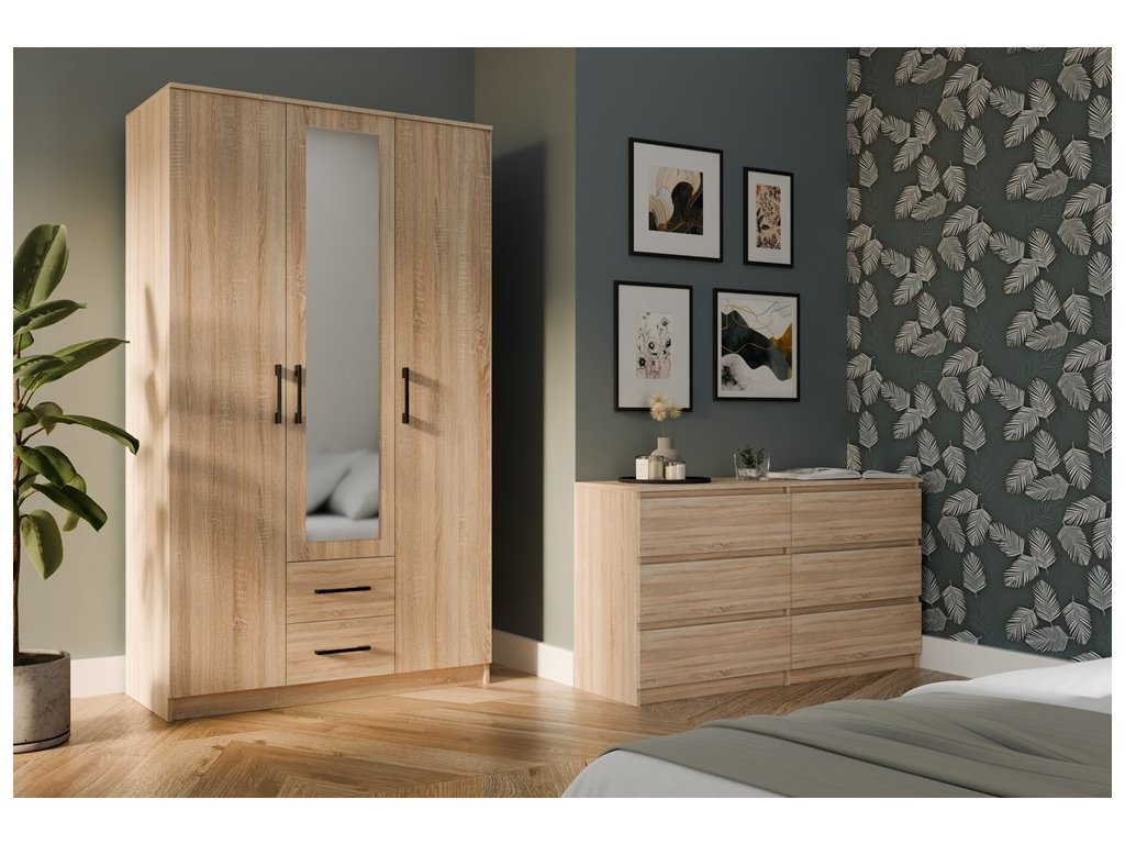 Moderní šatní skříň se zrcadlem z kolekce ROMA nabízí stylové řešení úložného prostoru pro váš domov i kancelář. Díky promyšlenému vnitřnímu uspořádání s trojicí dveří, praktickými policemi, šatní tyčí a dvěma zásuvkami se skříň skvěle hodí do ložnice, dětského pokoje, pracovny i předsíně. Zrcadlo umístěné na čelní straně dodává nábytku funkční prvek a opticky zvětšuje prostor. Univerzální design působí přirozeně a elegantně zároveň. Černé úchyty přidávají moderní kontrastní detail, který skříň vizuálně zvýrazní v každém interiéru.