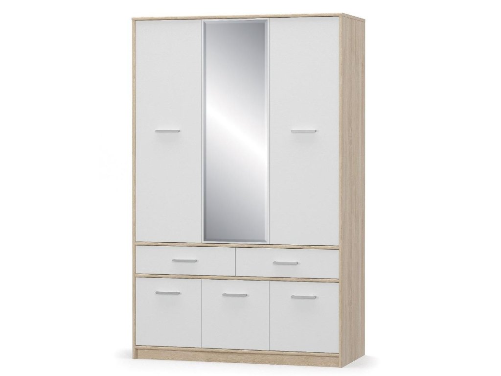 Šatní skříň třídveřová s dalšími 3 spodními dvířky, 2 zásuvkami a zrcadlem ze sektorového nábytku v moderním provedení. Skříň je vyrobena z kvalitní LTD desky v barevné kombinaci dub sonoma / bílá mat. Nabídka komponentů této sektorové řady umožňuje sestavit si nábytek do obývacího, dětského nebo studentského pokoje dle vlastních představ. Dodáváme v demontovaném stavu.Doplňkové parametry