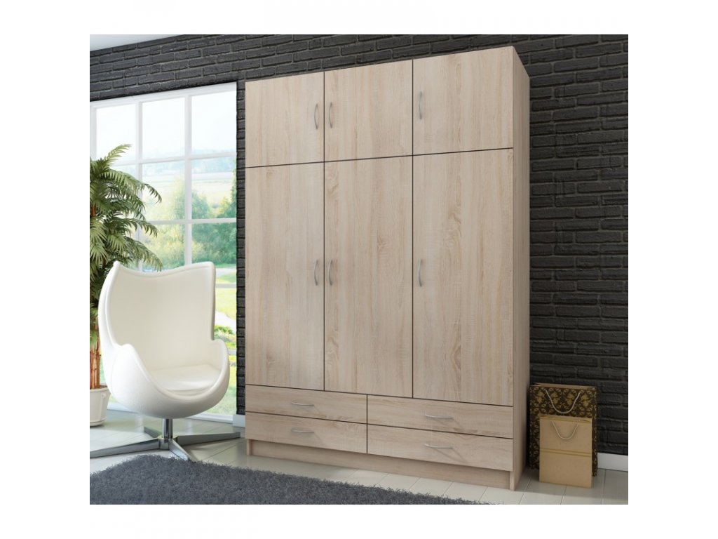 Praktická třídveřová skříň v oblíbeném dekoru dub sonoma. Nabízí kombinaci polic, šatní tyče a tří zásuvek pro přehledné uložení oblečení i doplňků. Šířka 135 cm, výška 194 cm, hloubka 54,6 cm – ideální velikost, která poskytuje dostatek místa, šetří prostor a hodí se i do menších místností. Vyrobena z kvalitního lamina, snadno se udržuje a dodává interiéru svěží, moderní vzhled.