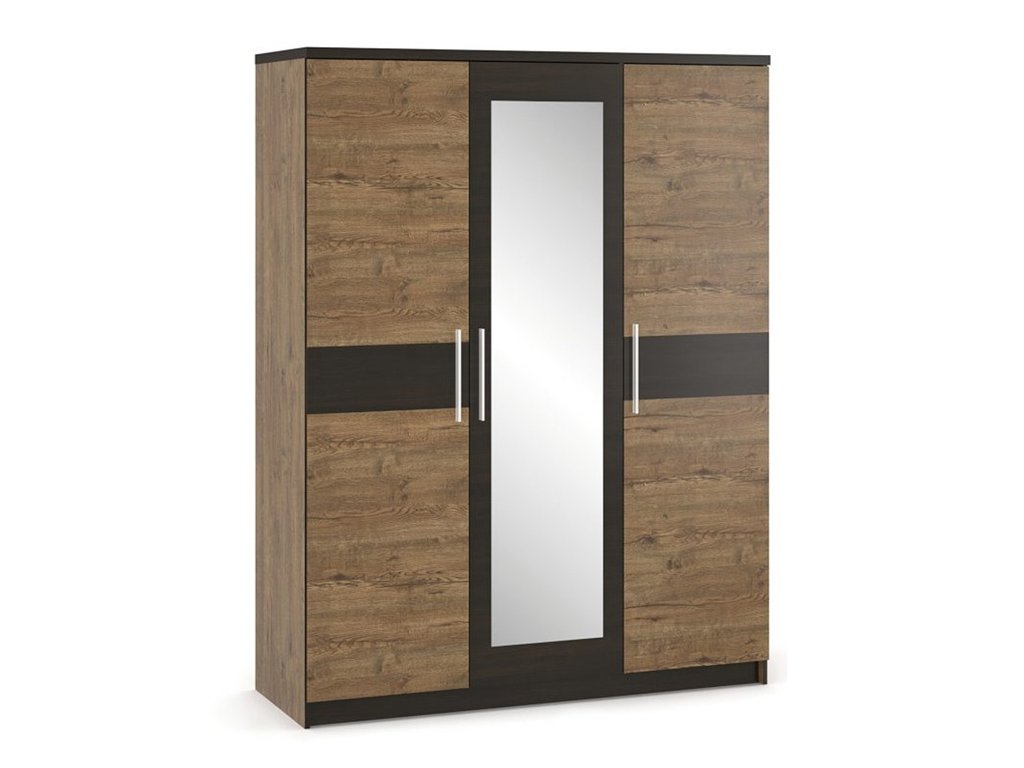 Šatní skříň třídveřová s z ložnicové řady. Moderní provedení v kontrastních barvách dokonale doplní váš interiér. Šatní skříň je vyrobena z kvalitní LTD desky v barevné kombinaci dub april/wenge. (Výrobce nezaručuje horizontální či vertikální provedení barvy dubu april). Skříň obsahuje uprostřed praktické zrcadlo. Nabídka komponentů této sektorové řady umožňuje sestavit si nábytek do ložnice nebo studentského pokoje dle vlastních představ. Dodáváme v demontovaném stavu.Doplňkové parametry