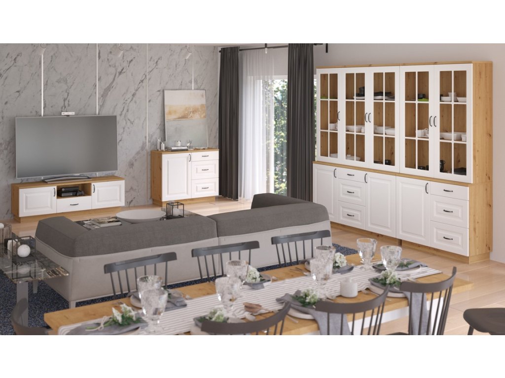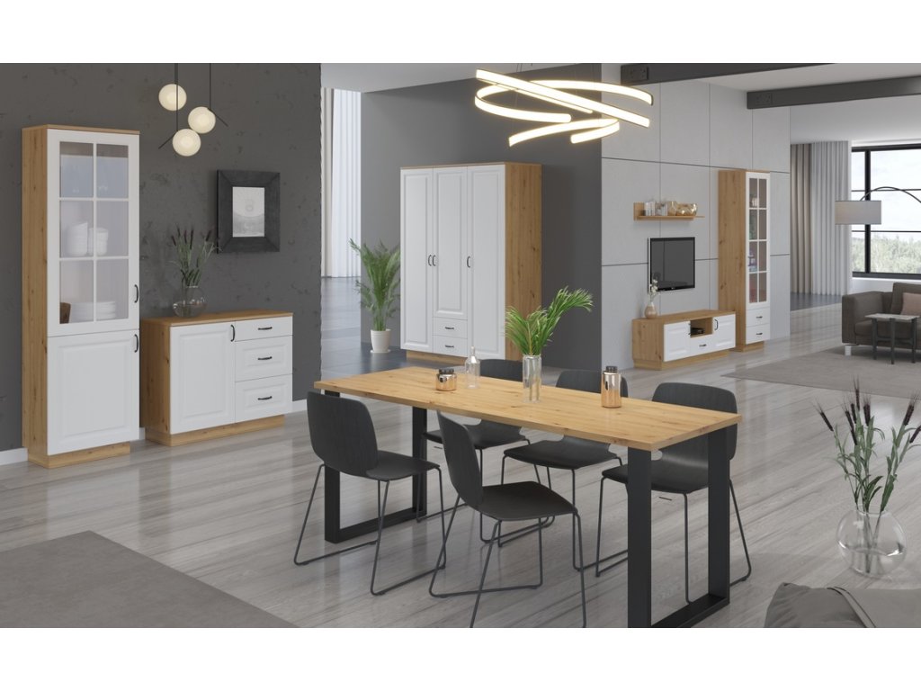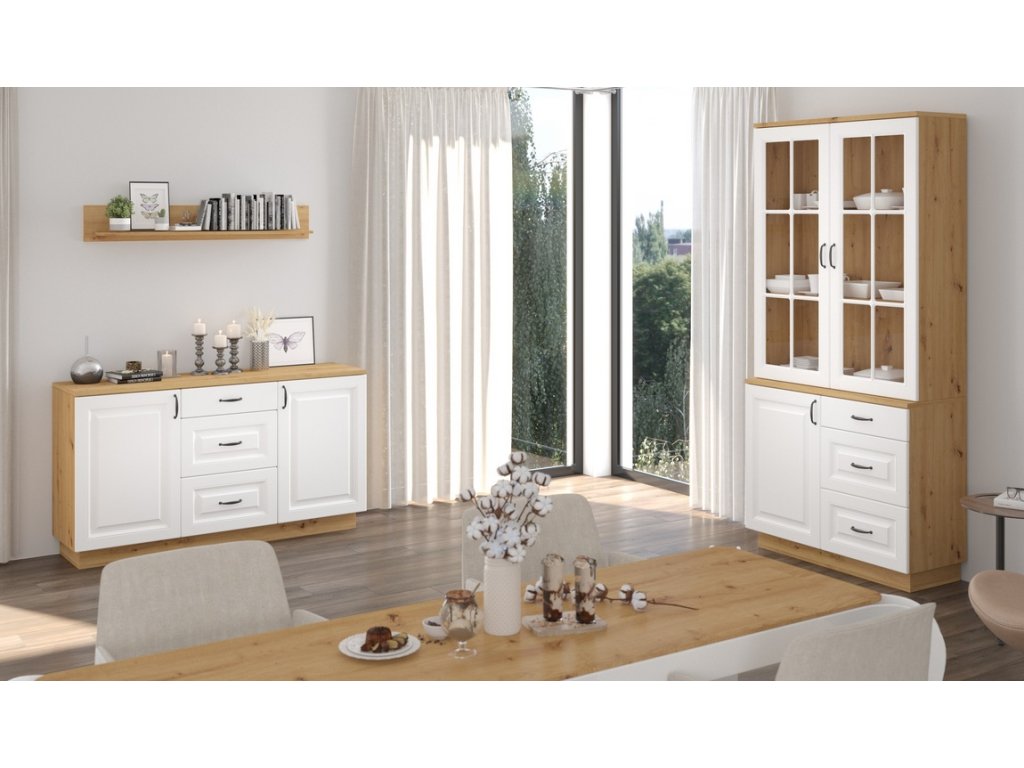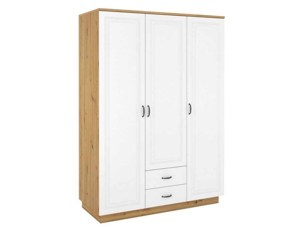 Šatní skříň třídveřová se dvěma zásuvkami v moderním provedení venkovského stylu. Korpus je vyroben z kvalitního lamina v barvě dub artisan, dvířka a čela zásuvek jsou vyrobena z desky MDF v barvě bílé. Úchyty jsou kovové černé. Rozložení polic a vnitřního uspořádání viz. perokresba. Dodáváme v demontovaném stavu.Doplňkové parametry