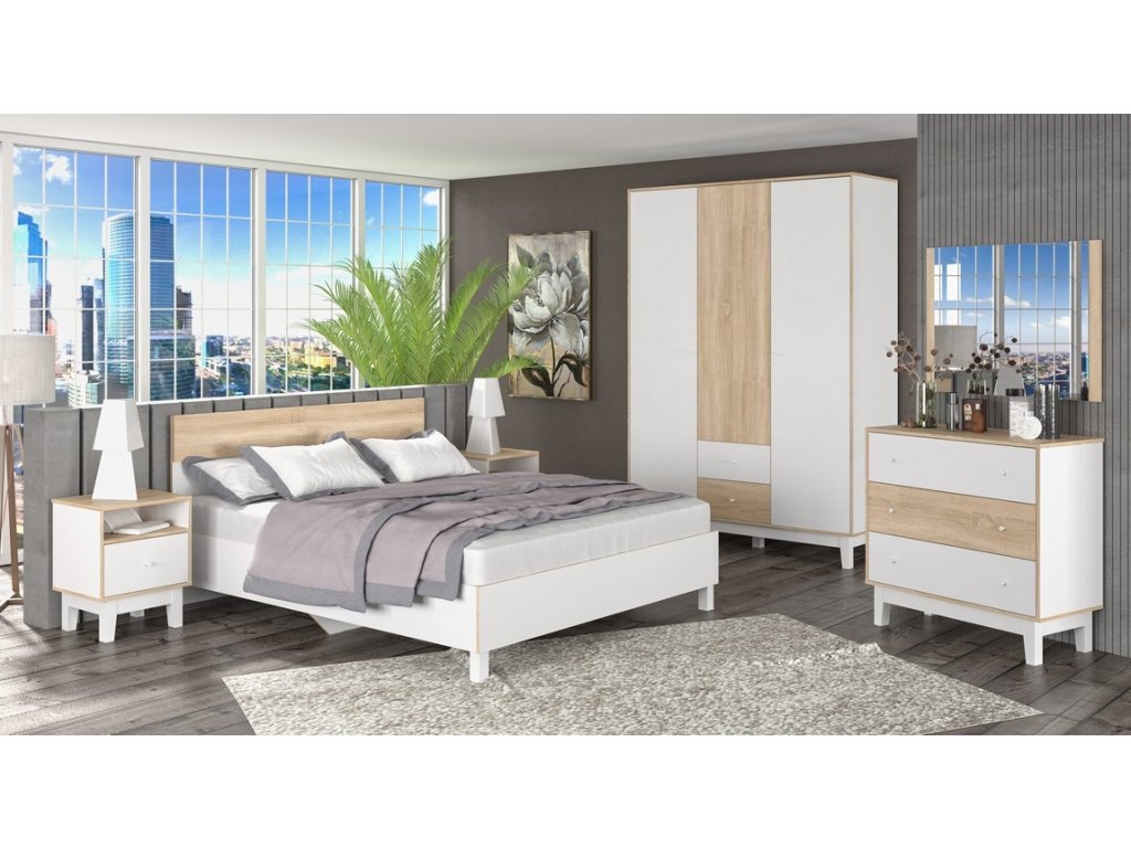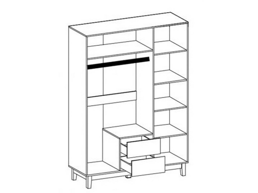 Šatní skříň třídveřová v moderním provedení v jemných barvách. Nábytek je vyroben z kvalitní LTD desky v barevné kombinaci bílá/dub sonoma. V levé části skříně je šatní tyč, nad ní police a ve spodní části jsou dvě zásuvky, v pravé části jsou 4 police. Dodáváme v demontovaném stavu.Doplňkové parametry