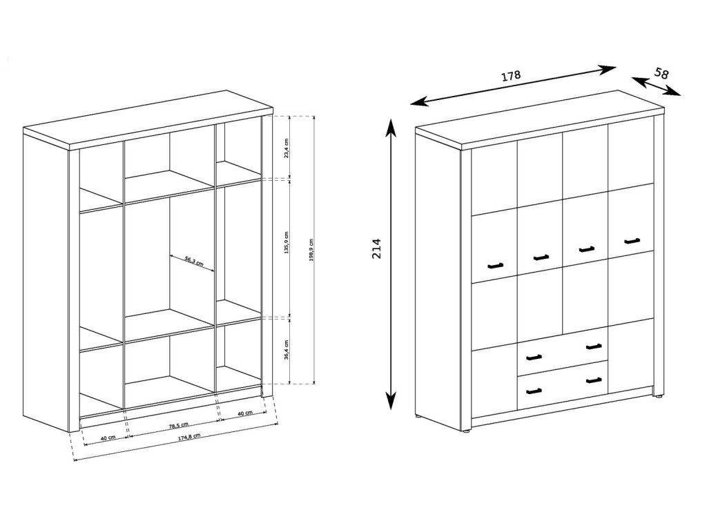 Kombinovaná šatní skříň. Skříň má 4 dveře a 2 zásuvky. V prostření části skříně je uvnitř skříně šatní tyč a nahoře jedna polička. Po bocích jsou skříně s šatní tyčí a poličkou nahoře i dole. Systém je exkluzivní kolekce navržena v moderním duchu. Celá řada se vyznačuje elegancí a jednoduchými tvary, které zaručují plné využití prostoru. Nábytek je vyroben z kvalitního lamina s ABS hrany ( 0,5-0,8 mm ). Barevné provedení jasan tmavý. Dodáváme v demontovaném stavu.Doplňkové parametry