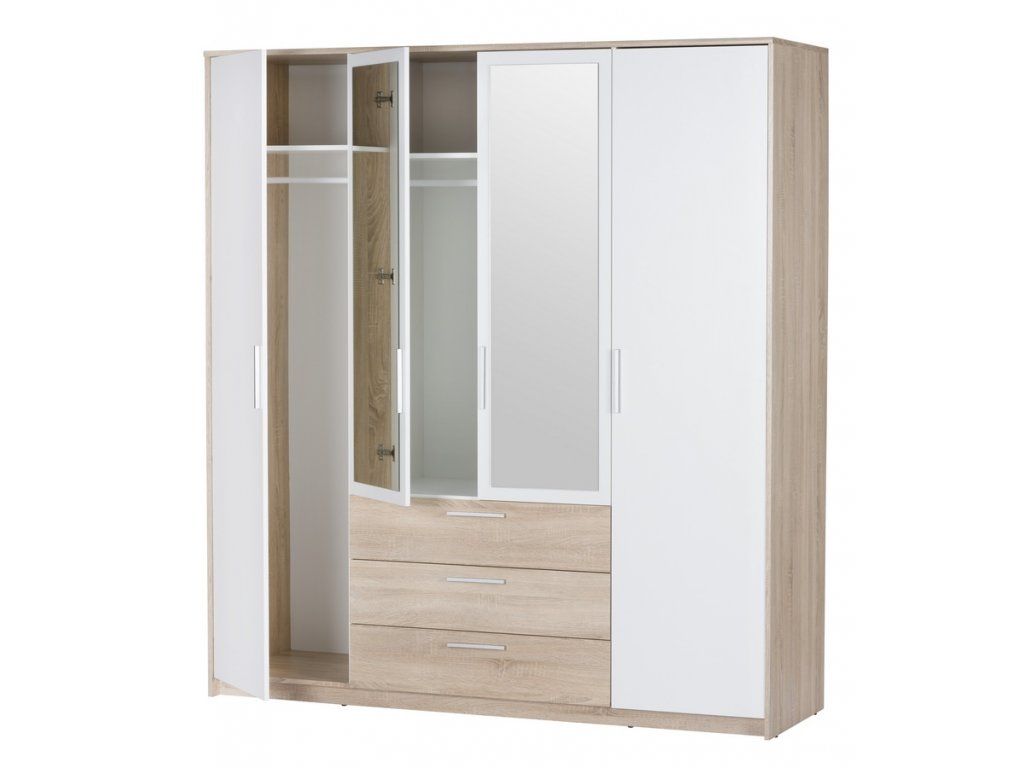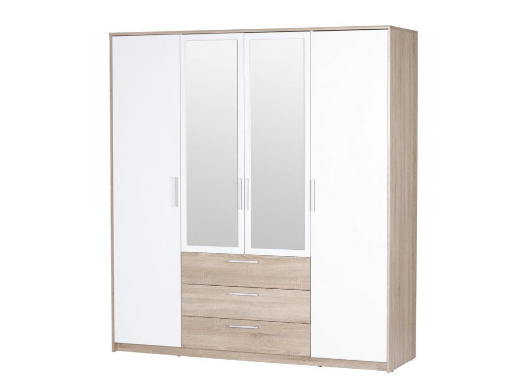 Šatní skříň čtyřdveřová z kolekce MILO v moderním provedení. Korpus i dvířka jsou z kvalitního LTD, barevné provedení - dub sonoma s bílou. Skříň obsahuje praktické zrcadlo. Na levé straně je šatníková tyč a 1 police, na pravé jsou 4 police, uprostřed je tyč, police a 3 zásuvky ( viz perokresba ). Dodáváme v demontovaném stavu.Doplňkové parametry