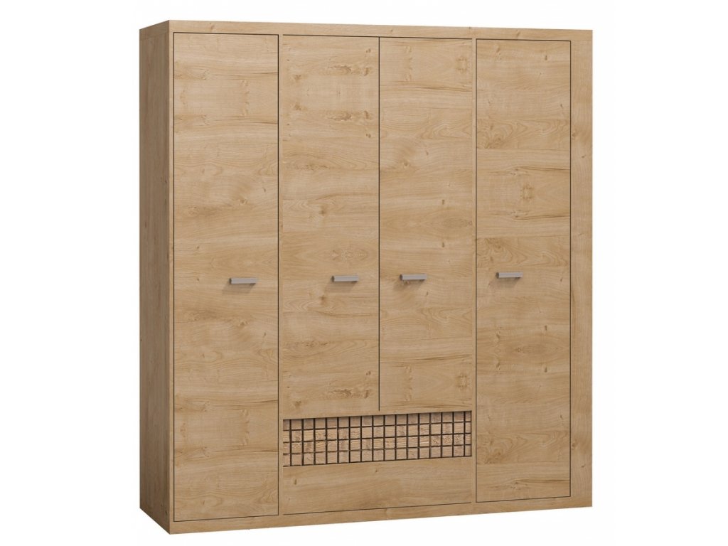 Šatní skříň 4-dveřová se 2 zásuvkami. Jedná se o stylovou kolekci nábytku moderního stylu, který je vhodný do obývacího pokoje a ložnice. Barevné provedení dub ribbeck. Vsazením ozdobné kostičkované lišty je zvýrazněn rustikální vzhled masivního dřeva. Nábytek je vyroben z kvalitního lamina 16 mm, některé desky jsou zesíleny na 48 mm, vše ohraničené ABS páskou. Možnost dokoupení LED osvětlení. Dodáváme v demontovaném stavu.Doplňkové parametry