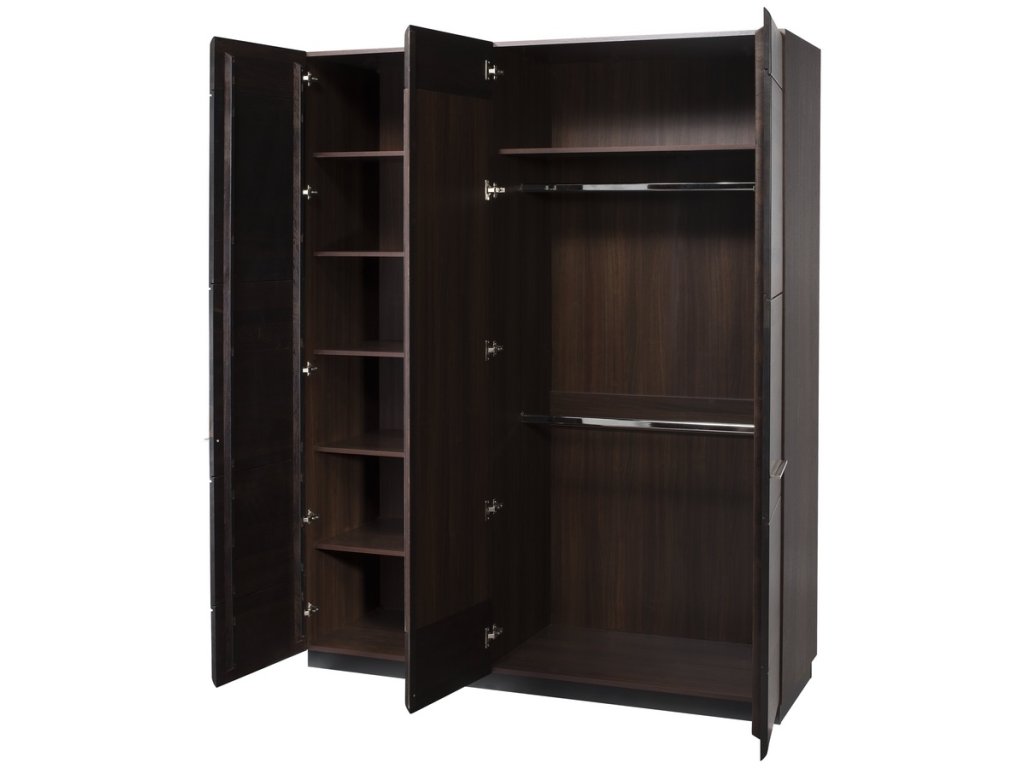 Šatní skříň se zrcadlem ze sektorové řady PORTI značkového výrobce Szynaka. Skříň má 3 dveře. Systém PORTI je exkluzivní kolekce navržena v moderním duchu. Struktura ušlechtilého masivního dubu na přední straně a přírodní dýha na korpusu zdůrazňuje velmi klasickou barvu čokoládový dub. Opakující se prvek riflování v kombinaci s černým sklem je dekorační motiv, který se odráží v každém bloku. Celá řada se vyznačuje elegancí a jednoduchými tvary, které zaručují plné využití prostoru. Barevné provedení - čokoládový dub. Elegantní úchyty jsou z kovu. Dodáváme v demontovaném stavu.Doplňkové parametry
