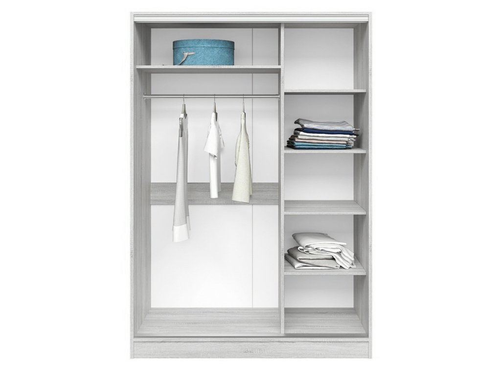 Šatní skříň s posuvnými dveřmi je vyrobena z LTD desky odolné vůči poškrábání v barvě dub sonoma. Dveře skříně jsou doplněny zrcadlem. Uvnitř skříně je v levé části šatní tyč a police, v pravé části jsou 4 police. Dodáváme v demontovaném stavu.Doplňkové parametry
