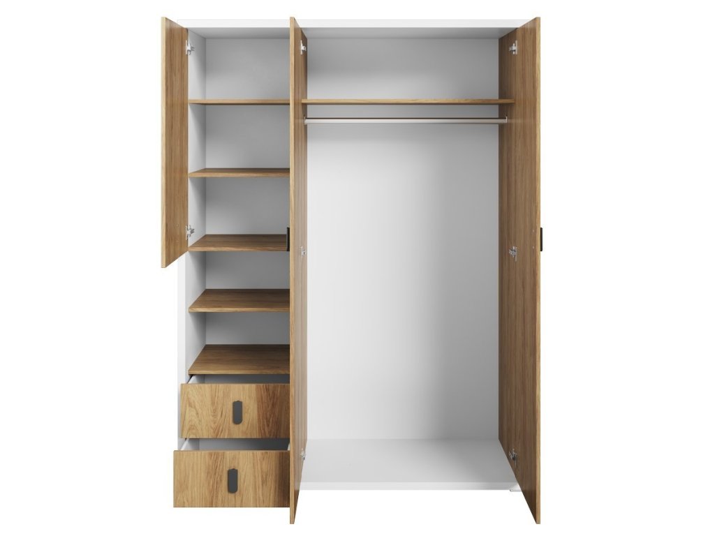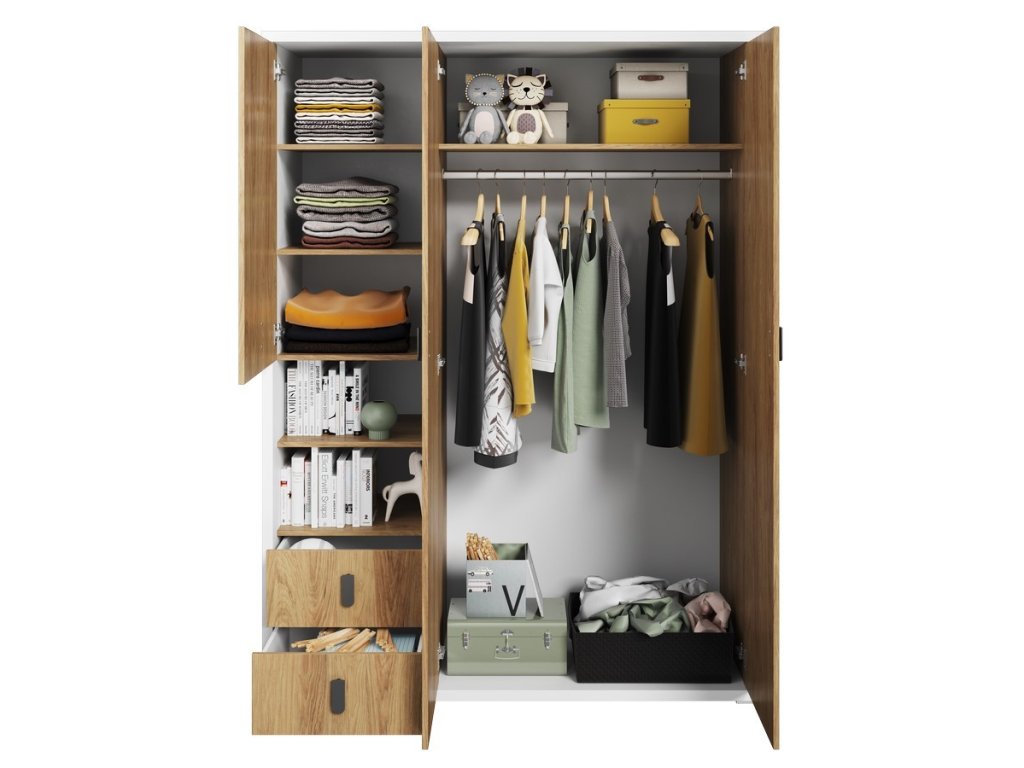 Šatní skříň třídveřová v jemném přírodním stylu. Korpus je vyroben z desky LTD v barvě bílá, dvířka, čela zásuvek a police jsou vyrobeny z desky LTD v barvě ořech natural. Uvnitř skříně je šatní tyč a police, ve spodní části jsou dvě zásuvky. Dodáváme v demontovaném stavu.Doplňkové parametry